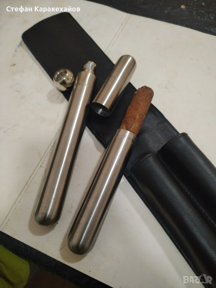 Неизползван, включва шише за алкохол, контейнер за пура и кожен калъф