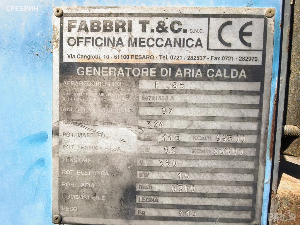 Италиански котел на дърва за топъл въздух, с мощност 115кв. В долната част на котела под горивната камера има вентилатор, който изважда топлия въздух в горната част на котела. Цена 2000 ЕВРО. За повече информация по телефона 0894313702 Сребрин Петров адрес село Черганово на 2 км от Казанлък срещу фабрика за дървени къщи ECOZID darvodelskimachini.alle.bg