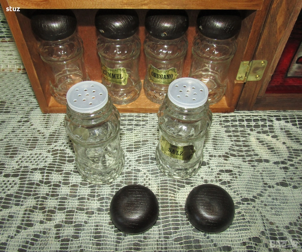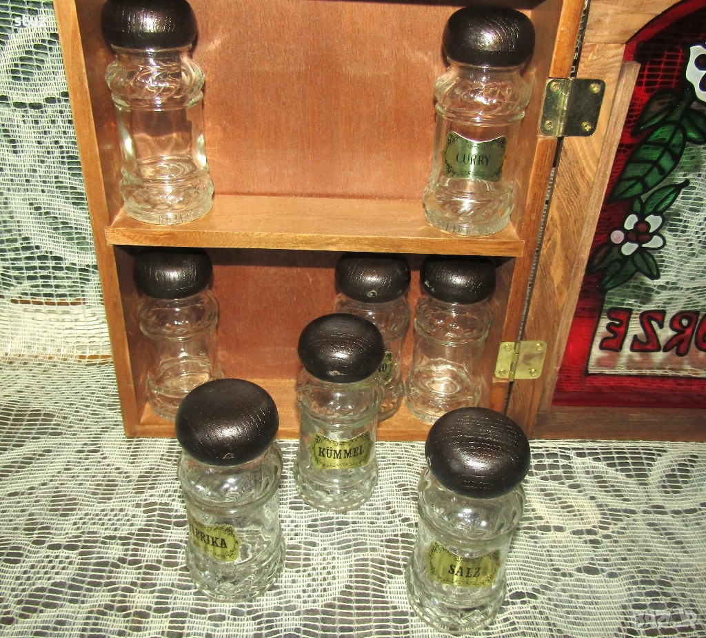 Наборът съдържа витрина, поставка за 8 шишенца за подправки. Витрината се затваря с магнитен шнапер на вратичката.