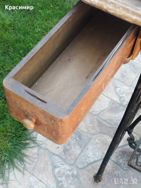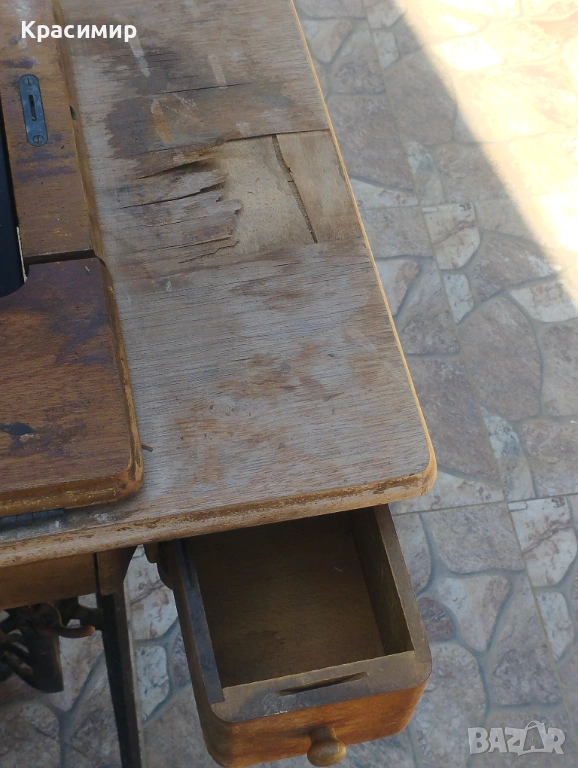 Истинска класика, подходяща както за ценители и колекционери, така и за декорация на домове, ателиета или заведения. Машината е монтирана на оригинален дървен плот с две чекмеджета и стабилна чугунена основа с крачен педал.