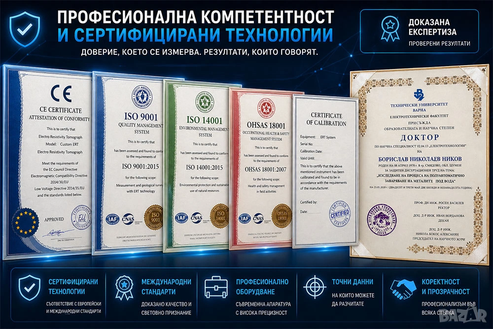 -Професионално геофизично и хидрогеоложко проучване с електрорезистивен томограф (ERT) до 100 и до 600 метра дълбочина;