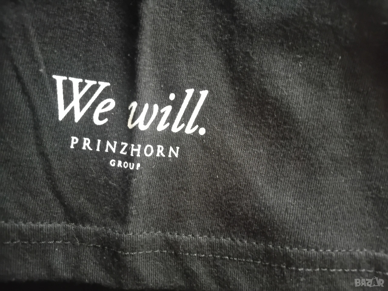 Цвят черен, с малък надпис на левия ръкав, тениската е размер XL.