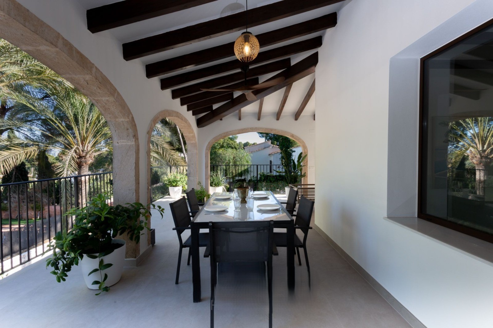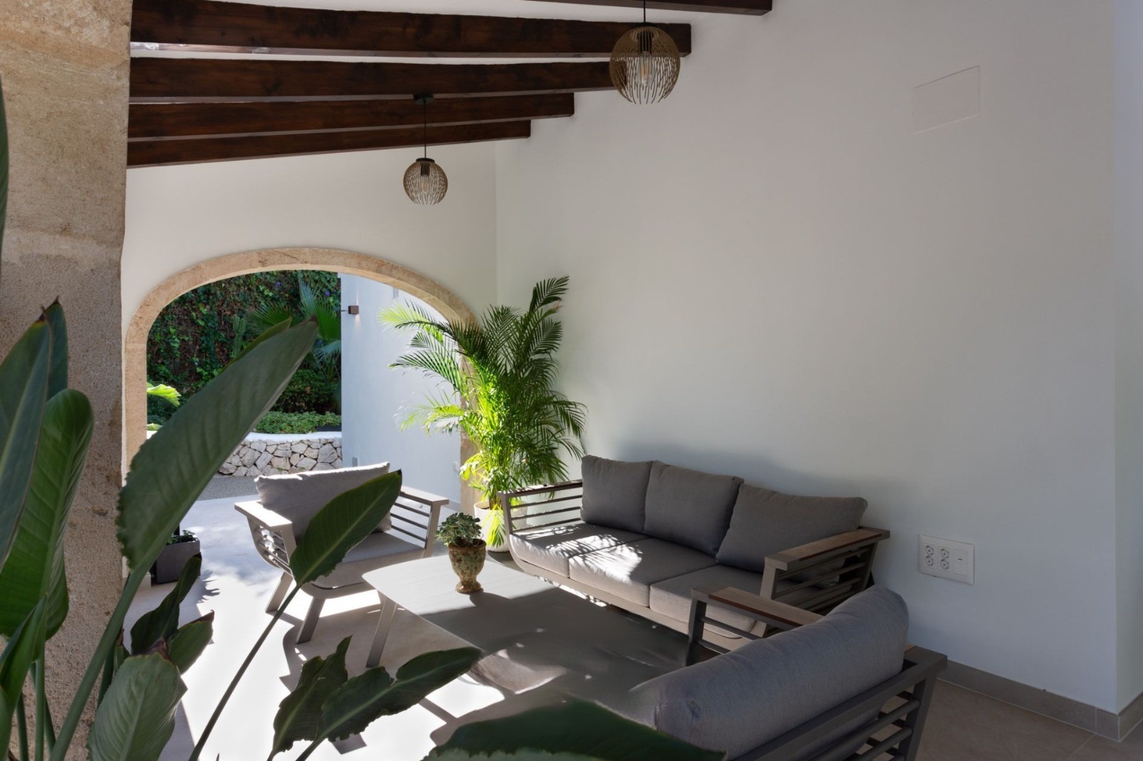 Благодарение на приятния климат на Хавеа, почти изцяло покритата веранда на входа на къщата осигурява достатъчно място за релакс и мебели за отдих, както и зона за хранене на открито.