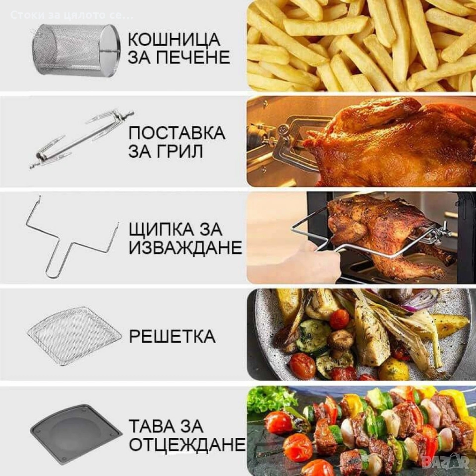 Допълнителни: Въртяща се кошница за пържене, въртящ се шиш – идеален за печено пиле, плъзгащи се решетъчни тави за различни ястия, тава за печене