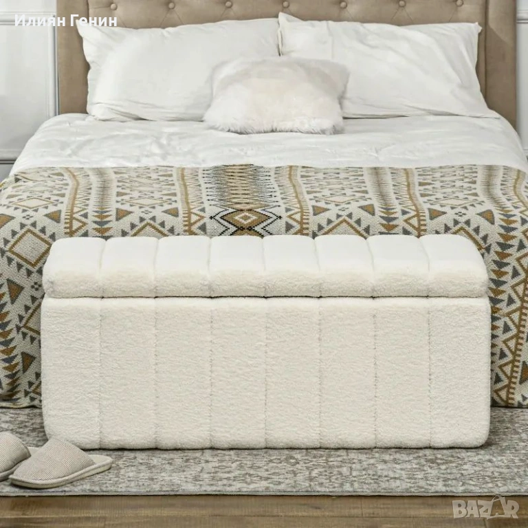 Модерен вид: Снабдена с бял, уютен калъф от полар с капитониран модел, пейката за съхранение добавя топлина и се вписва хармонично във вашия интериор.