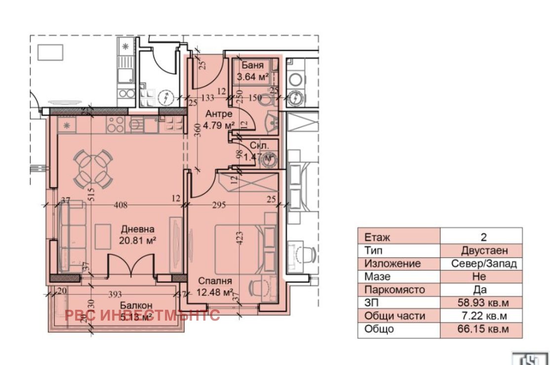 Апартаментът е с 66.15 кв.м. обща площ заедно с 58.93 кв.м. чиста площ и е разположен на втори жилищен етаж, с изложение Северо запад. Имотът се предлага на етап - шпакловка и замазка по БДС.