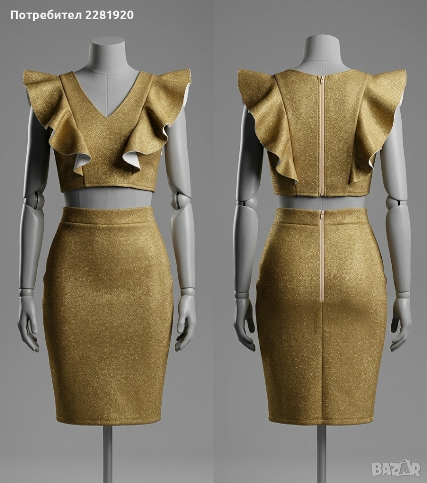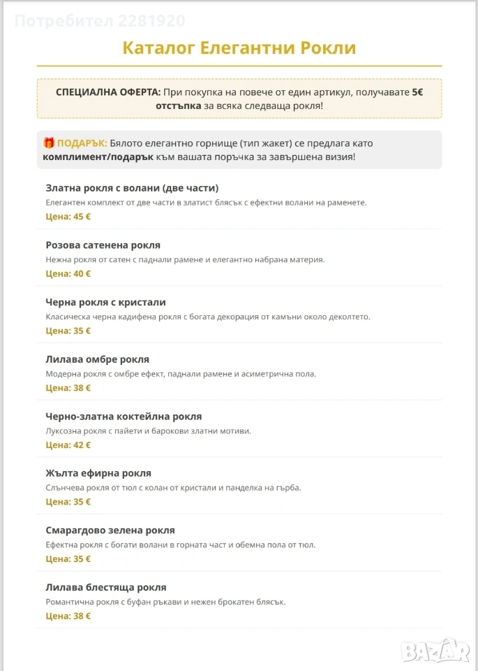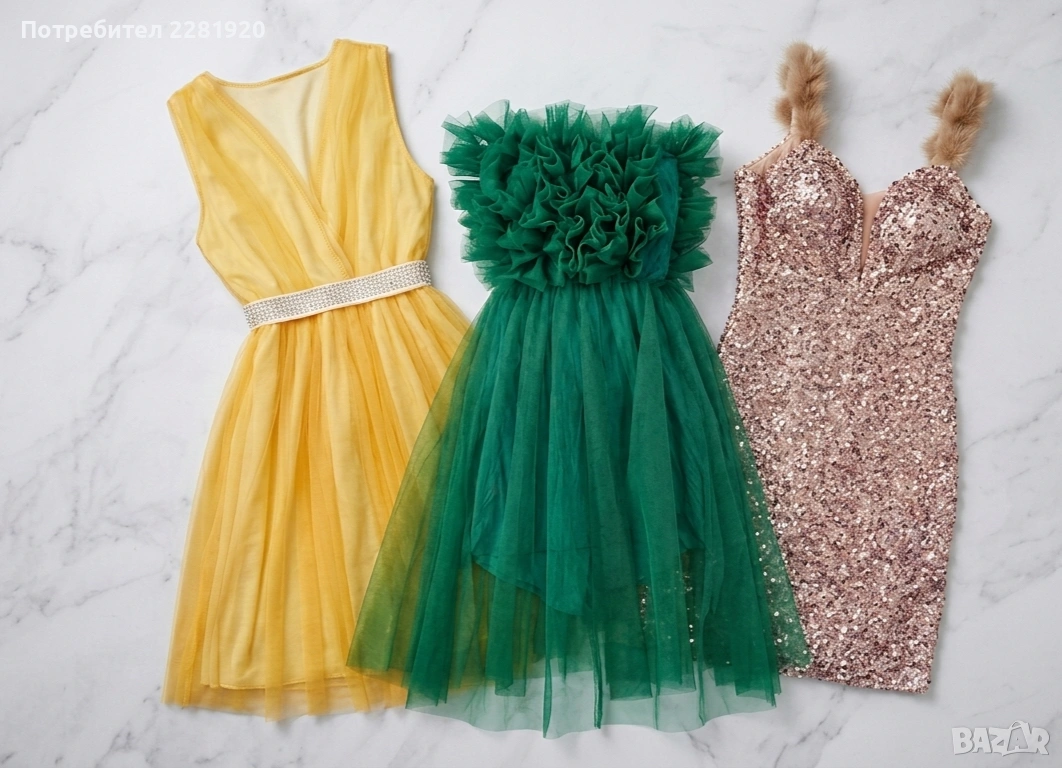 СПЕЦИАЛНА ОФЕРТА: При покупка на повече от един артикул, получавате 5€ отстъпка** за всяка следваща рокля! ПОДАРЪК: Бялото елегантно горнище (тип жакет) се предлага като комплимент/подарък към вашата поръчка за завършена визия! 1. Златна рокля с волани (две части) Елегантен комплект от две части в златист блясък с ефектни волани на раменете. Цена: 45 €** 2. Розова сатенена рокля Нежна рокля от сатен с паднали рамене и елегантно набрана материя. Цена: 40 € 3. Черна рокля с кристали Класическа черна кадифена рокля с богата декорация от камъни около деколтето. Цена: 35 € 4. Лилава омбре рокля Модерна рокля с омбре ефект, паднали рамене и асиметрична пола. Цена: 38 € 5. Черно-златна коктейлна рокля** Луксозна рокля с пайети и барокови златни мотиви. Цена: 42 € 6. Жълта ефирна рокля Слънчева рокля от тюл с колан от кристали и панделка на гърба. Цена: 35 € 7. Смарагдово зелена рокля Ефектна рокля с богати волани в горната част и обемна пола от тюл. Цена: 35 € 8. Лилава блестяща рокля Романтична рокля с буфан ръкави и нежен брокатен блясък. Цена: 38 € Изпращам с тест и преглед до офиси на Еконт и Спиди. При интерес се свържете с мен на Вайбър 0876886247 или тук на лично съобщение.