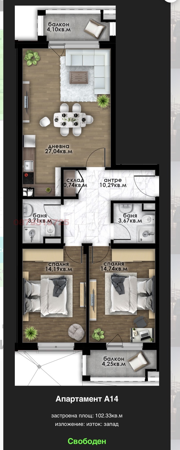 Разпределение:Дневна с трапезария, две спални, две бани+ws. склад, две тераси