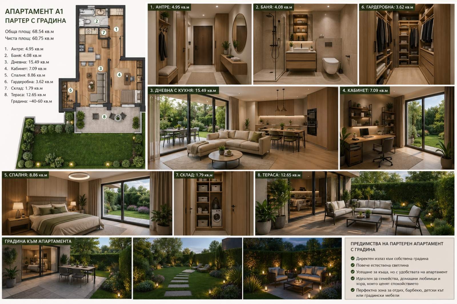 Апартаментът се отличава с дневна зона, функционално отделена нощна част,санитарно помещение, склад и тераса,която дава директен достъп до градината от 600 кв.м Осигуряващи отлична осветеност и комфортно обитаване. Разпределението е подходящо както за семейно жилище, така и за дългосрочна инвестиция.