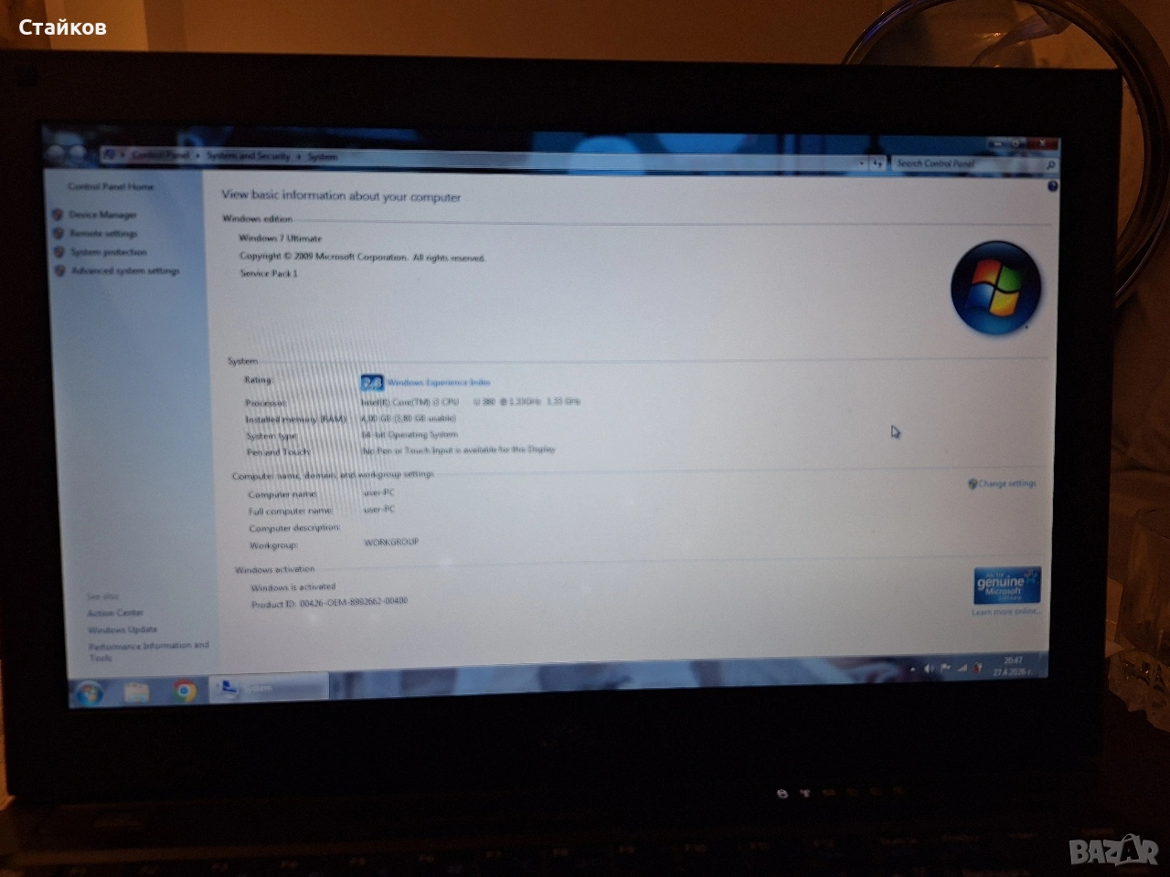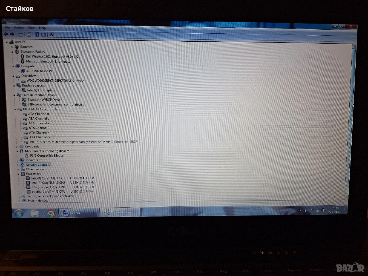 употребяван лаптоп Dell Vostro V130 ,работещ.Клавиатурата е повредена ,но работи през юсб с външна клавиатура.Батерията също не работи,като настолна машина е.Има зарядно към него. Подходящ за интернет ,печатане ,обработване на снимки и др. Процесор Intel Core i3-380UM (1.33GHz, 3MB L2 Cache, 800 MHz) Оперативна памет 2GB (1x2048MB) DDR 3 1333Mhz Видео карта Intel Graphics Media Accelerator 4500MHD Памет 320GB SATA 7200 rpm Екран 13.3 инчов (33.78 см) WXGA (1336х768) Матов дисплей Оптично устройство без оптично устройство Свързаност 10/100/1000 Mbps, WLAN 802.11a/b/g/Draft n, Bluetooth Батерия 6-клетъчна батерия с Уиндоус 7 профешънал.