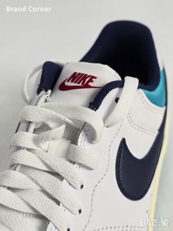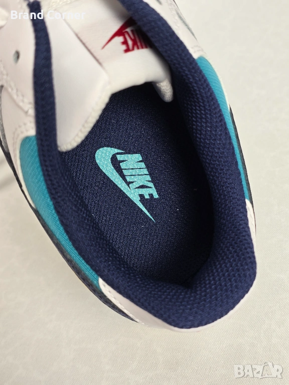 Моделът е вдъхновен от класическите баскетболни силуети на Nike и съчетава ретро визия с удобство за ежедневно носене. Обувките имат изчистена бяла горна част, тъмносин Nike Swoosh, тюркоазени акценти и леко повдигната подметка в vintage стил.