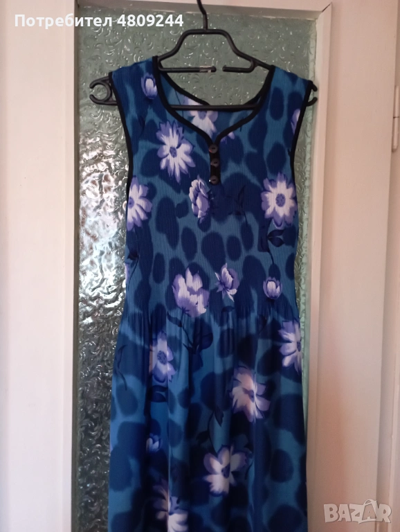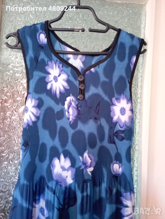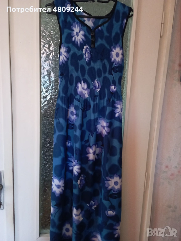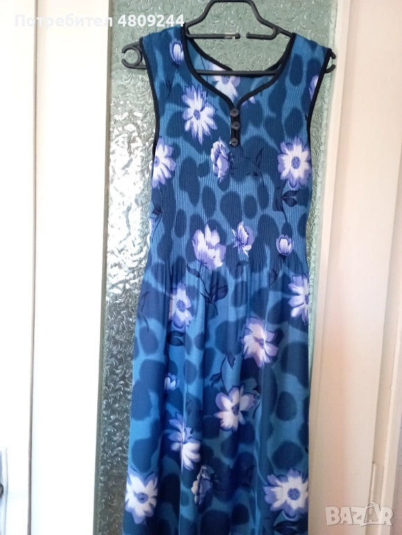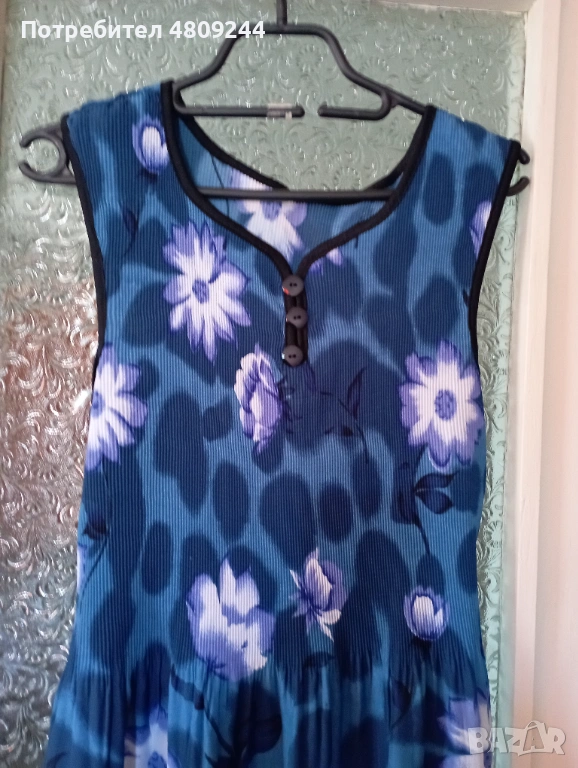 Дамска рокля в преобладаващ син цвят. Материята е приятна за носене. Роклята в горната част до талията е ластична. Долу отстрани има цепки. Не се спира. Ширина при раменете /от презрамка до презрамка/ – 39 см; от мишница до мишница – 46 см /става и повече, защото е ластично/; талия – 106 см; ханш – 136 см; обиколка долу – 140 см ;