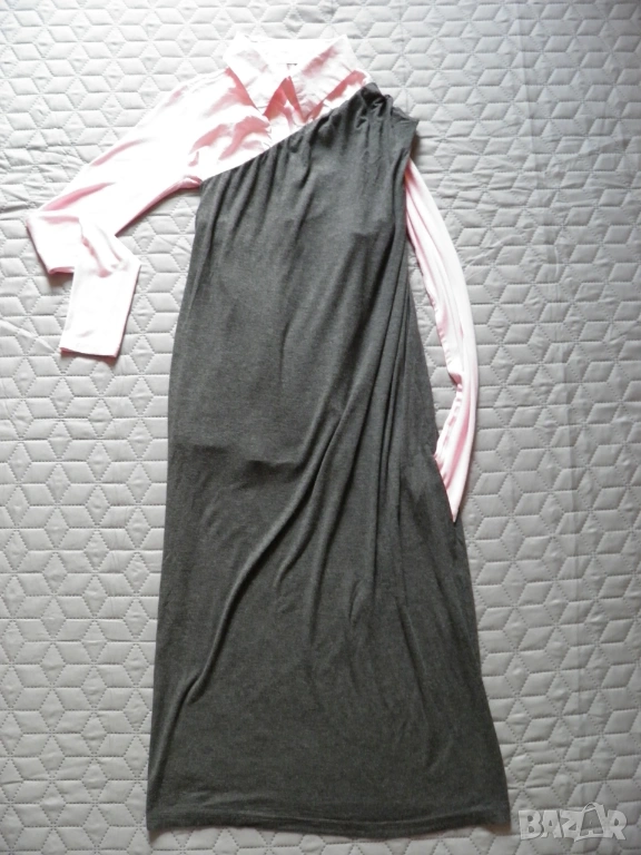 Асиметрична рокля с едно рамо. Размер S: дължина около 105 см., гръдна обиколка около 90 см. Състав: 95% вискоза, 5% еластан. В отлично състояние. Продава се без ризата. Ако имате интерес към нея, може да я откриете в друга моя обява.
