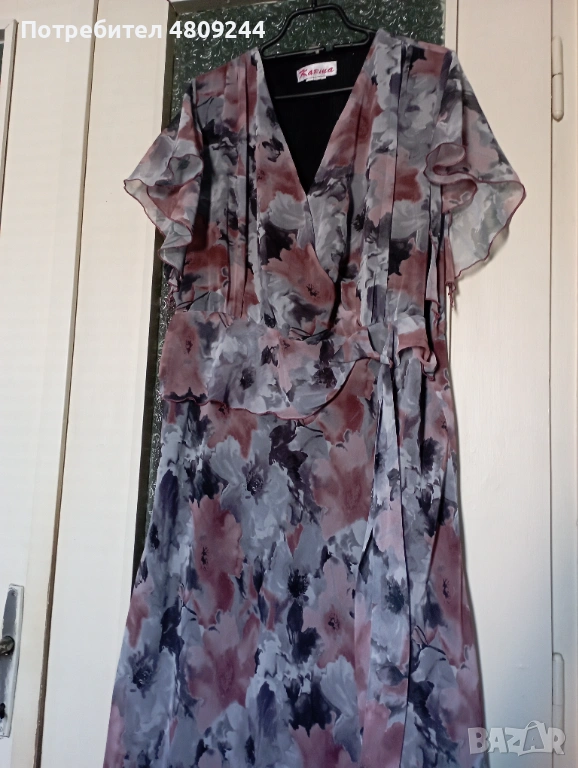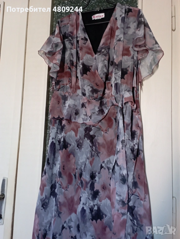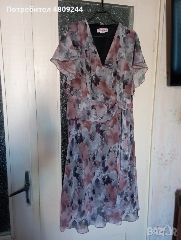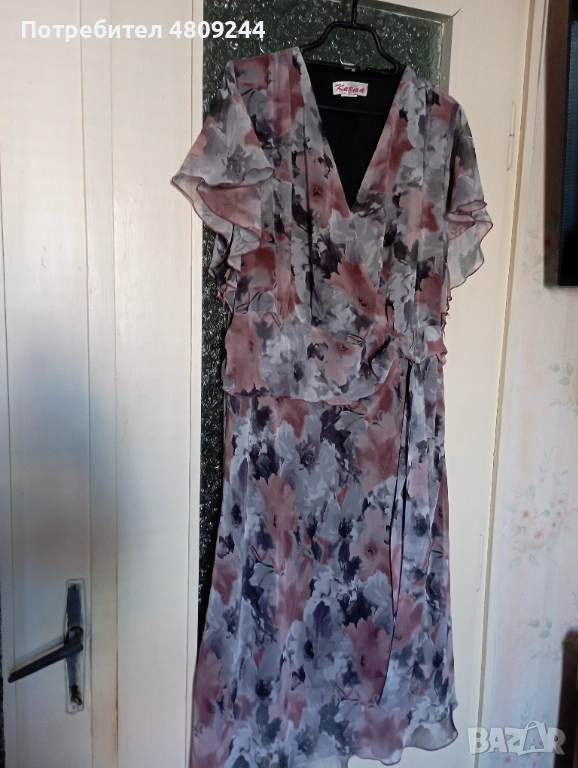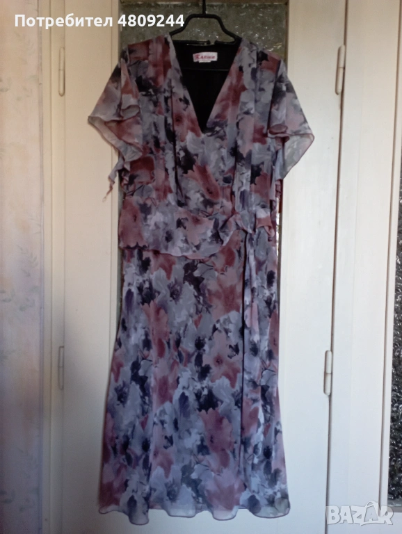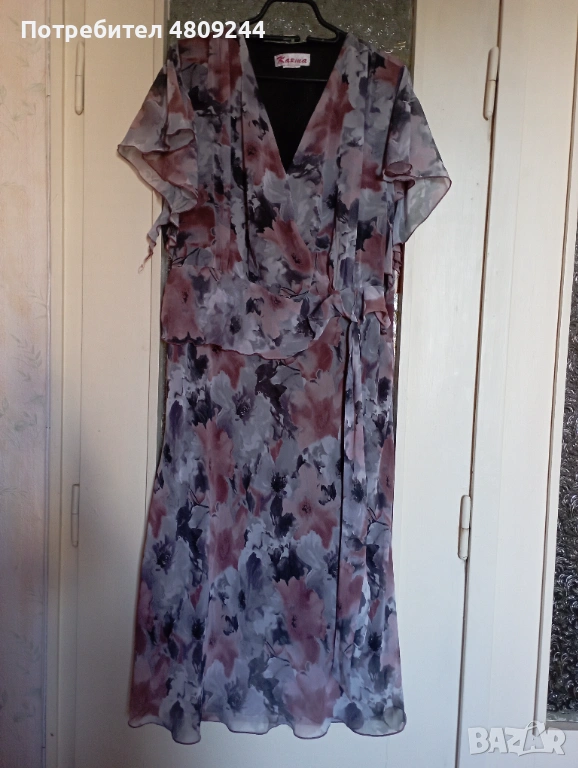 Елегантна дамска рокля. Материята е прозрачна и приятна за носене. Цялата рокля има подплата също от много приятна за носене материя /не е стандартен плат за подплати/. Не се спира. Ширина при раменете – 40 см; от мишница до мишница – 59 см; талия – 110 см; ханш – 124; дължина – 105 см;
