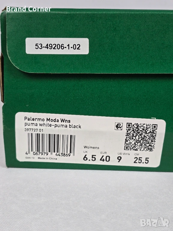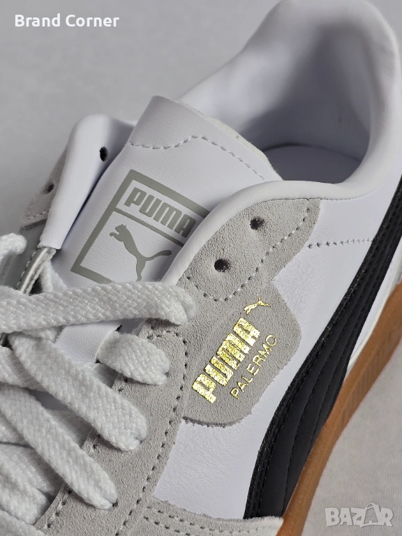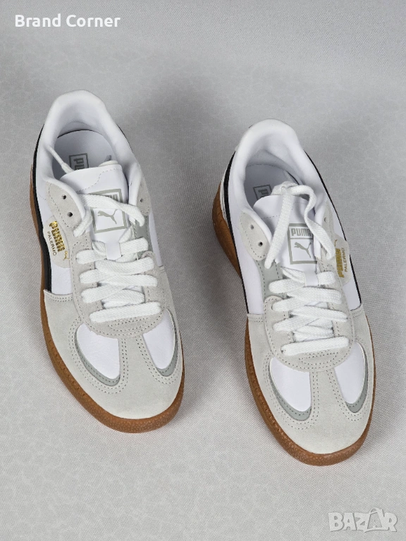 Нови оригинални дамски маратонки Puma Palermo Moda Wns в размер 40. Моделът е в много търсената комбинация PUMA White / PUMA Black с кафява gum подметка и златисто лого Puma Palermo отстрани.