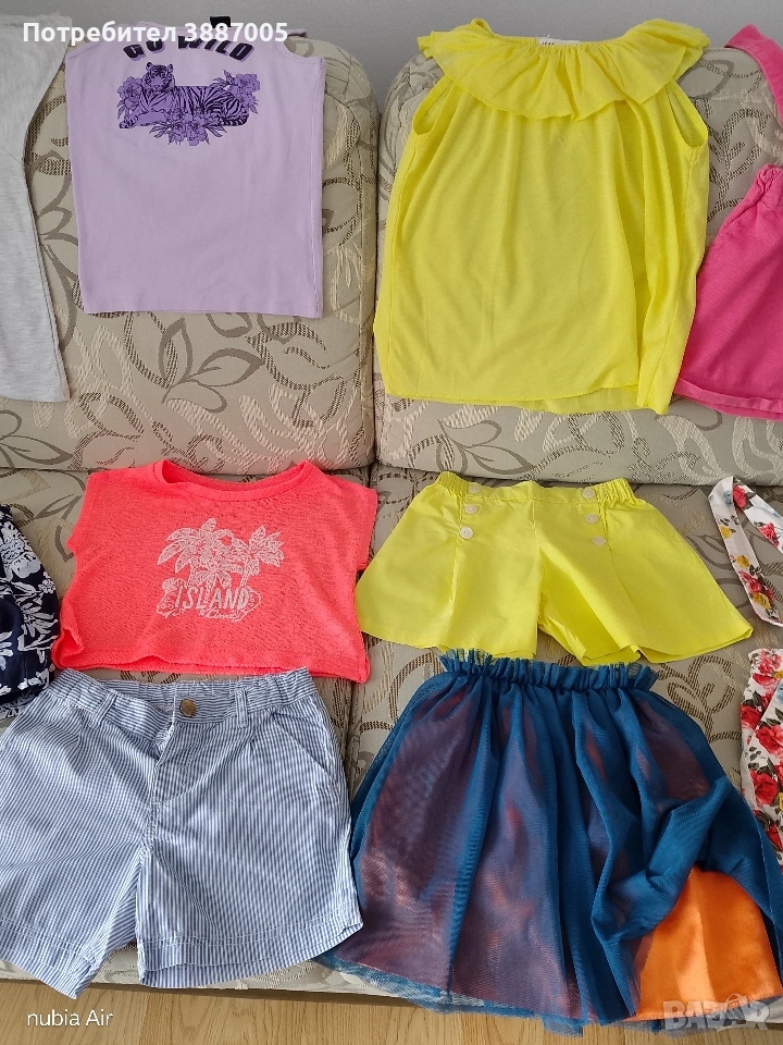 Лота съдържа 4 бр фланелки (потни чета) 2 бр. къси панталони +2бр с презррамки и2 бр поли дрехите са в много добро състояние. Няко и са от LC Waikiki H&M 5-6 paзмер.