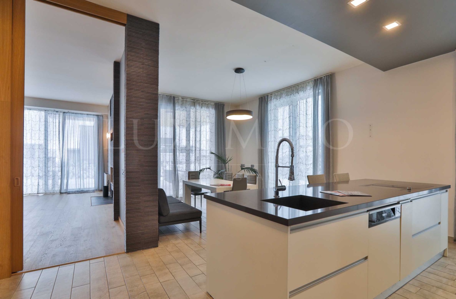 Партерния етаж е с 4 м. височина на таваните и се състои от входно антре, тоалетна, кухненски бокс с трапезария, преход към хол, който може да се отдели с плъзгащи врати и приземна тераса сливаща се с вътрешния двор. Изложенията са изток и север. В кухнята вградените уреди са Miele: двоен хладилник с фризер, фурна, кафе машина, миялна машина; BORA - вграден абсорбатор, индукционнен котлон и плоча за скара. Шкафовете са от МДФ с плот от техничен камък и остров с мивка, и шкафове. В трапезарията има разтегателна маса със столове и диван, в хола има голяма камина с чугунена камера и той може да бъде обзаведен според нуждите на наемателите. От трапезарията и дневната се излиза на голяма веранда с градинска мебел и барбекю;