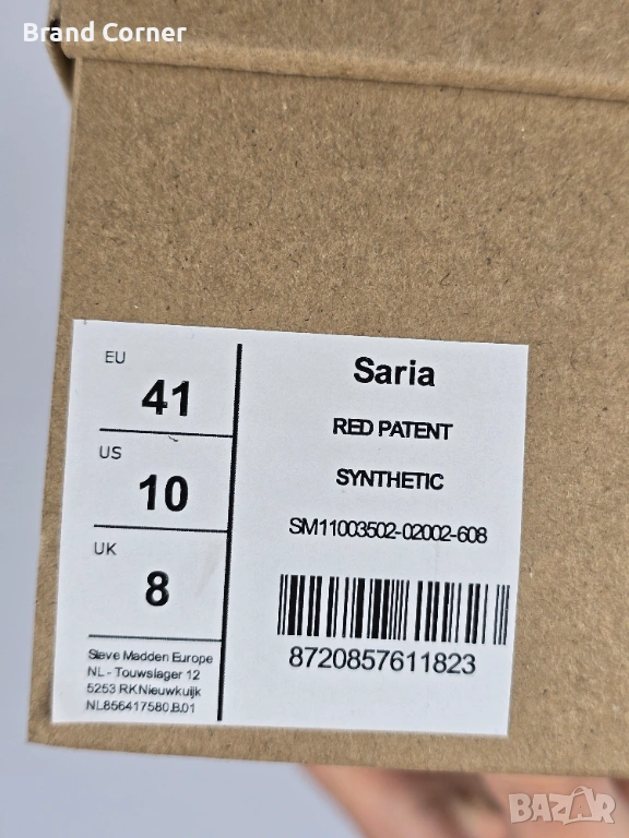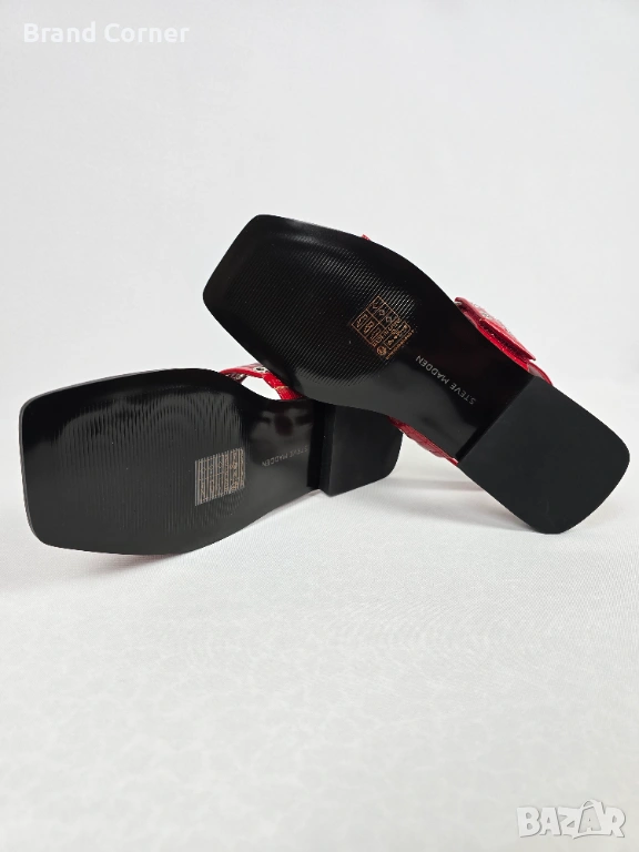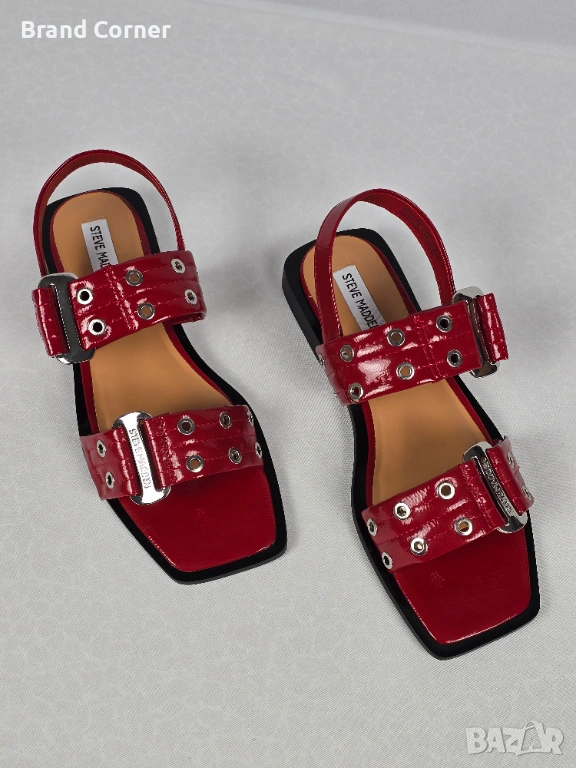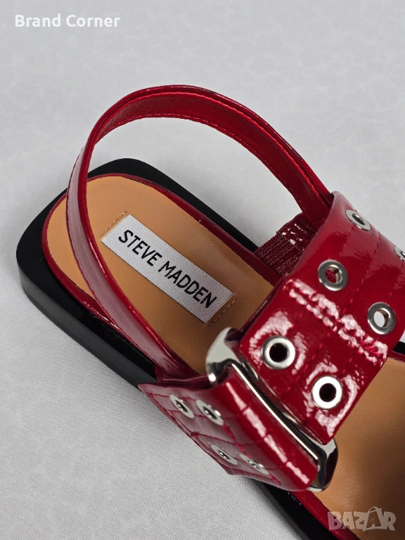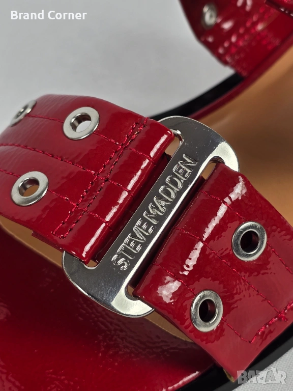 Моделът е изключително ефектен и модерен – в наситен червен лак, с широки каишки, метални капси и големи сребристи катарами с лого Steve Madden. Обувките са с актуална квадратна предна част, отворен дизайн и стабилна ниска подметка, което ги прави удобни както за ежедневието, така и за по-стилен летен аутфит.