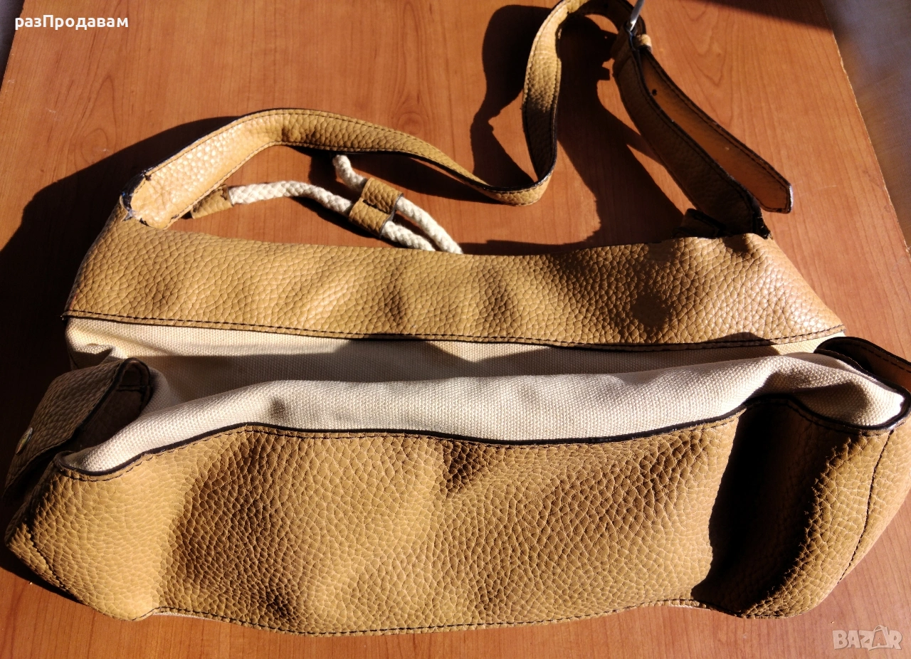 Чанта ~ марка ESPRIT . От плат и кожа, бежова ~ светло кафява~ екрю на цвят, с вътрешен джоб и ципове и 2 джобчета външни с капси.. Използвана е и за това се предлага за РЕКВИЗИТ ~ ТЕАТЪР ~ театрална постановка ~ Спектакъл , ФИЛМ ~ филмова продукция ~ КЛИП ...