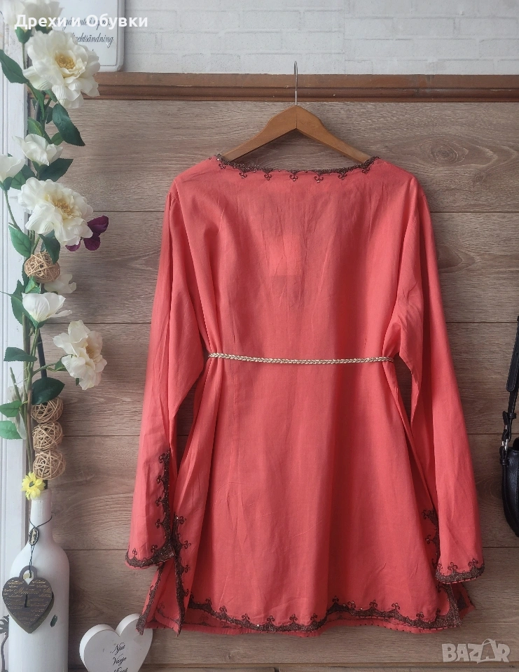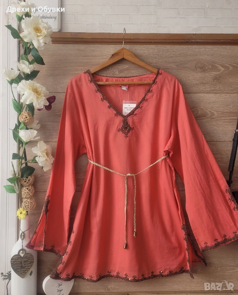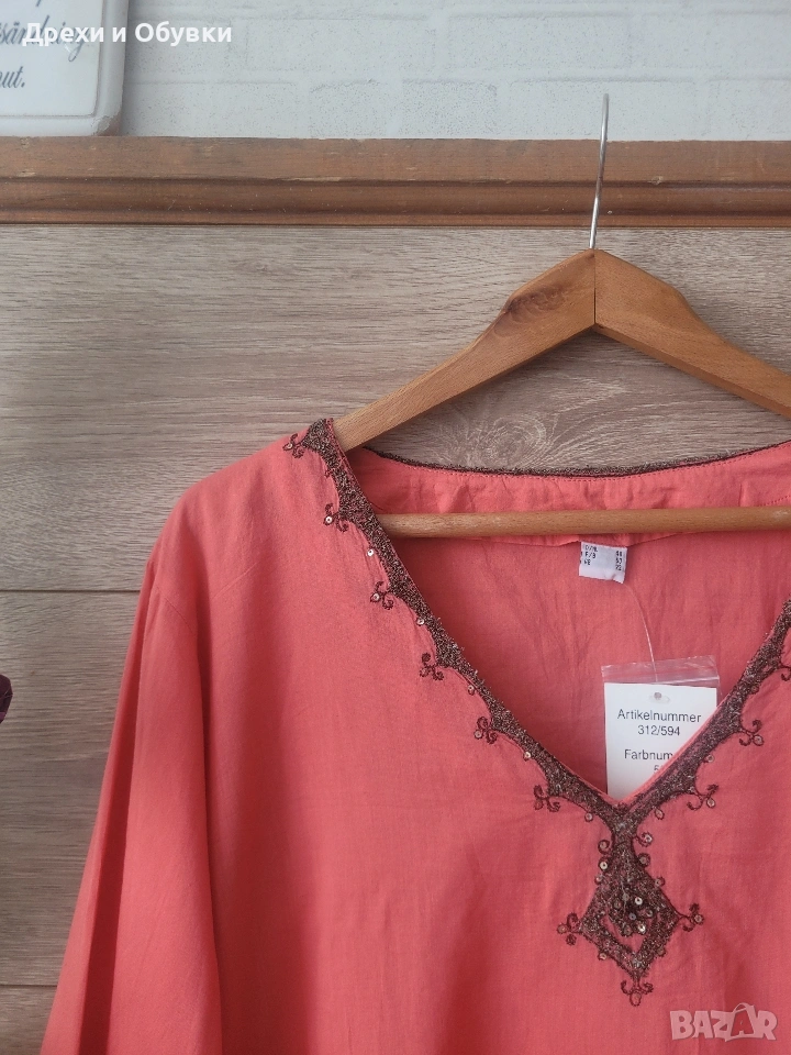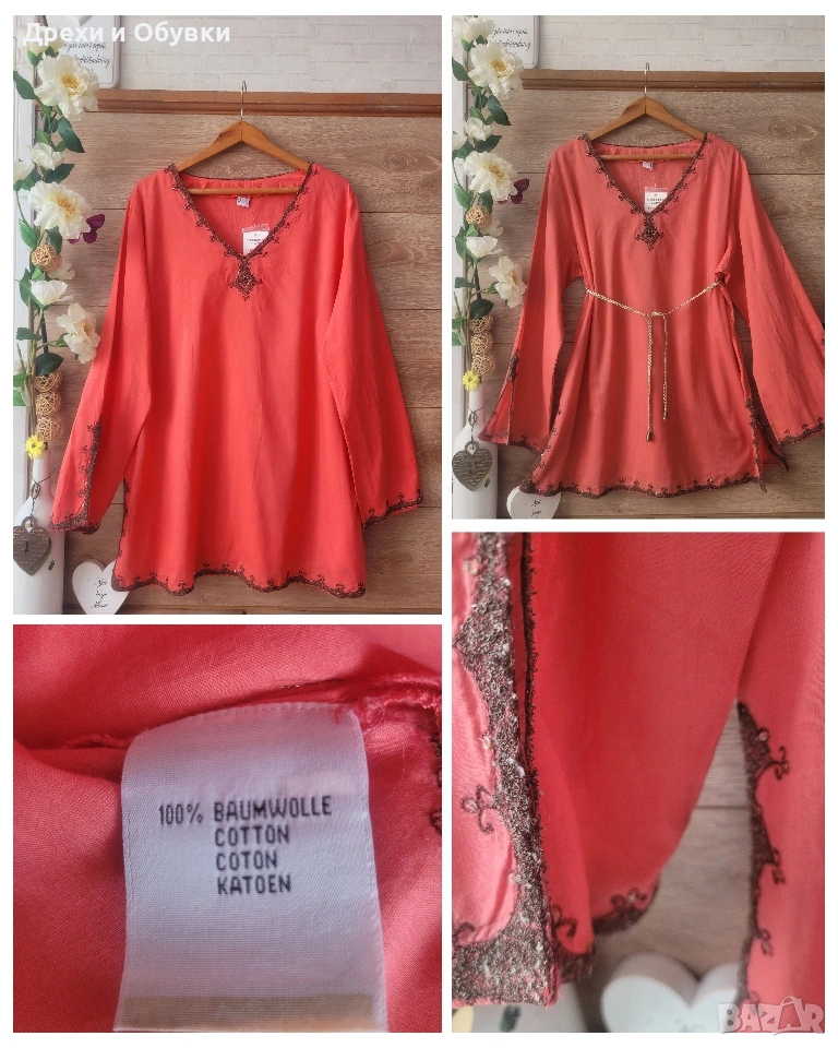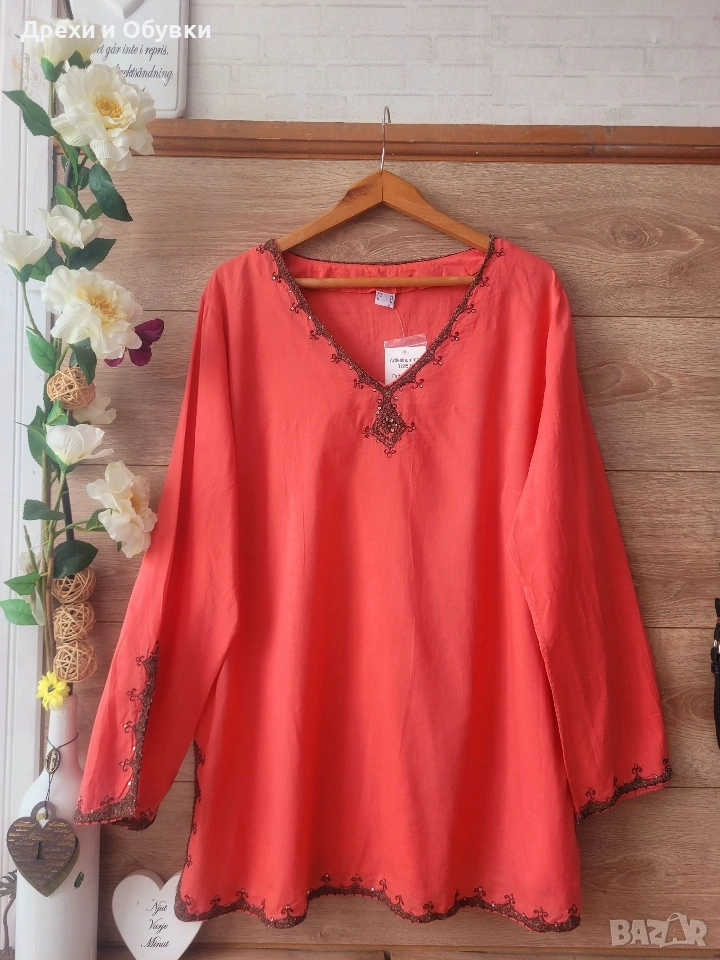 Нова с етикет дамска блуза/ туника в красив коралов цвят – перфектен избор за свежа и женствена визия. 🔹 Състояние: нова с етикет 🔹 Материя: 100% памук – лека, дишаща и много приятна на допир 🔹 Кройка: свободна, с падаща линия за комфорт през целия ден 🔹 Декорация: фина бродерия по деколтето,я ръкавите и подгъва 🔹 Размер ХЛ/2ХЛ Мерките сантиметри: Гръдна до 122см, дължина 75см Подходяща както за ежедневието, така и за по-специални поводи – комбинира се лесно с дънки, панталон или пола. Цена 22€