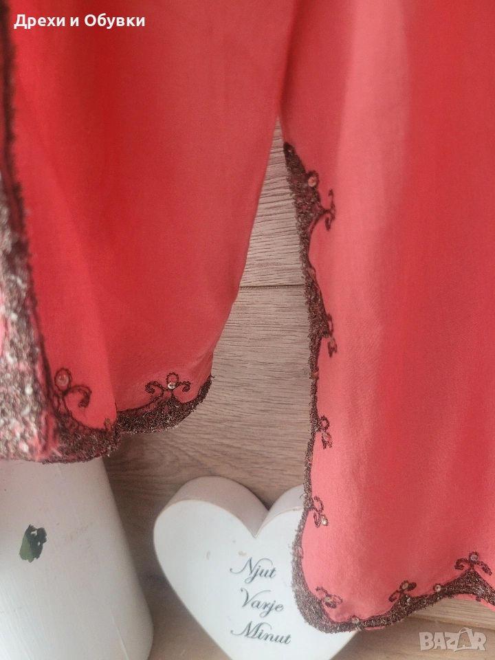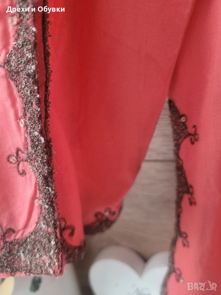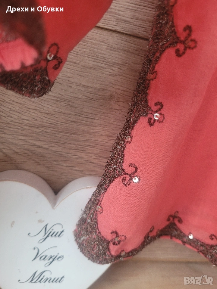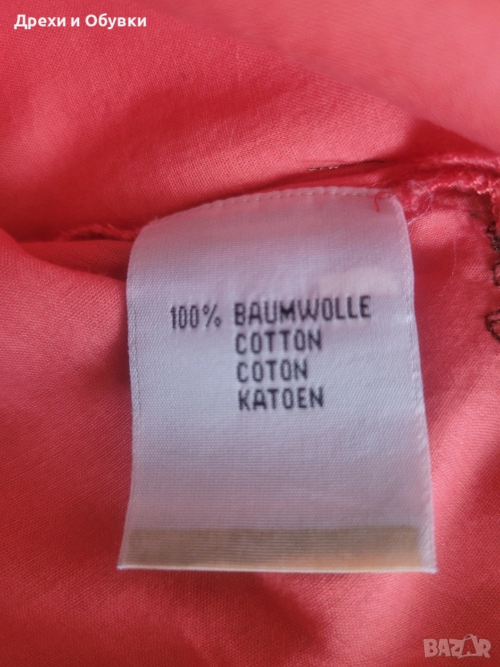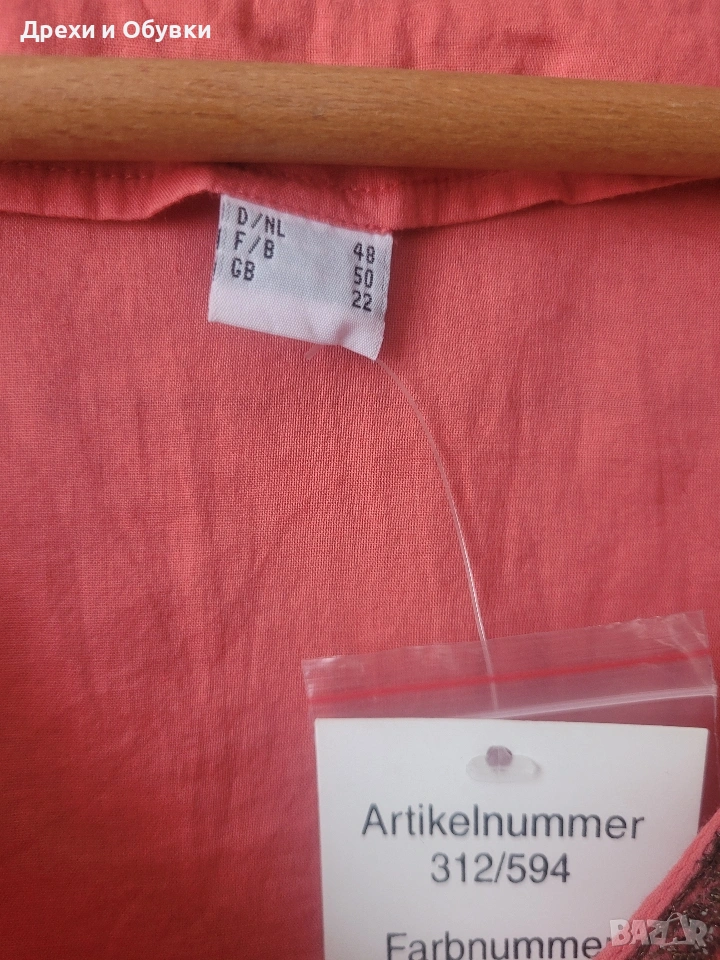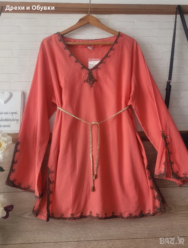 Нова с етикет дамска блуза/ туника в красив коралов цвят – перфектен избор за свежа и женствена визия. 🔹 Състояние: нова с етикет 🔹 Материя: 100% памук – лека, дишаща и много приятна на допир 🔹 Кройка: свободна, с падаща линия за комфорт през целия ден 🔹 Декорация: фина бродерия по деколтето,я ръкавите и подгъва 🔹 Размер ХЛ/2ХЛ Мерките сантиметри: Гръдна до 122см, дължина 75см Подходяща както за ежедневието, така и за по-специални поводи – комбинира се лесно с дънки, панталон или пола. Цена 22€