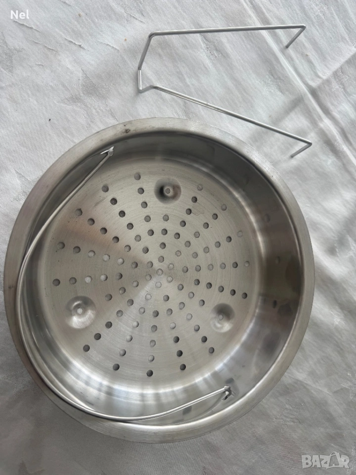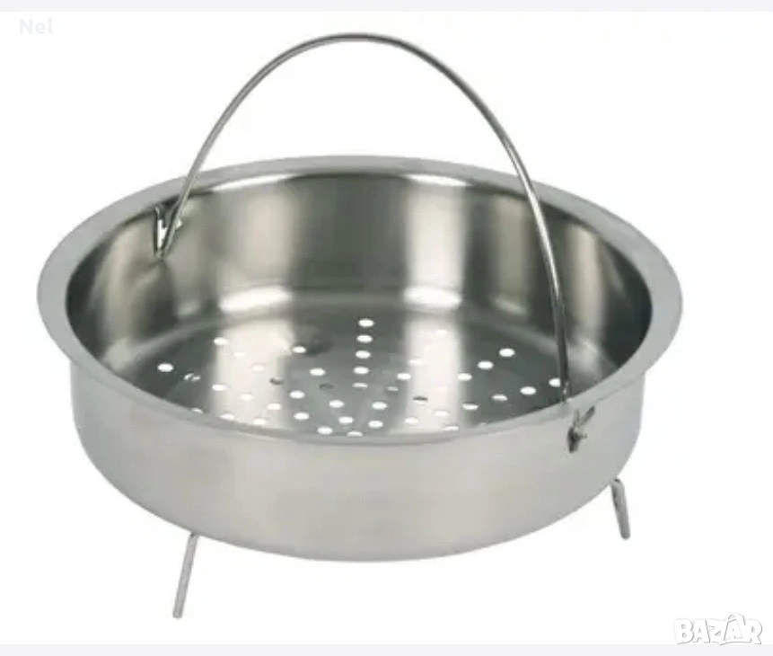 Нова кошница за готвене на пара Тефал SS-7122014588 Комплектът включва перфорирана кошница от неръждаема стомана и метална поставка, която я повдига над нивото на водата. Изработена е от висококачествена неръждаема стомана (Inox). Перфорирано дъно за циркулиране на парата. Метална дръжка за лесно изваждане на кошницата.Стойка (триножник) за повдигане на кошницата на около 70 мм над дъното. Диаметърът е 21см. Подходяща за съдомиялна машина.