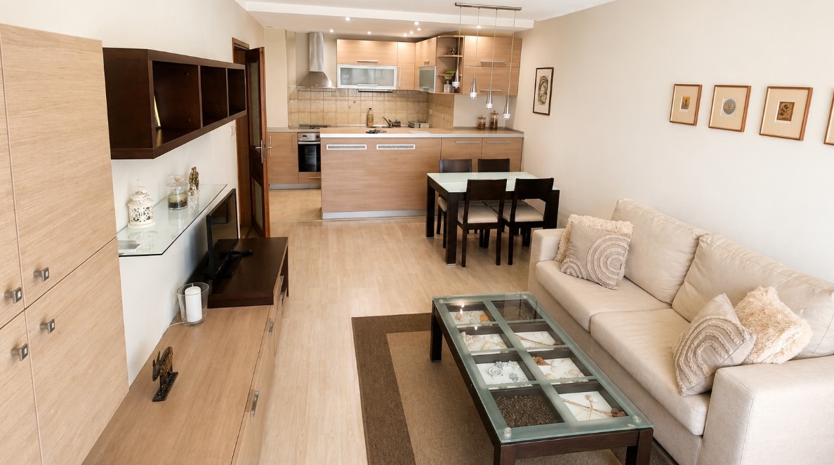 Имотът е обзаведен, с площ 60 кв.м, на 5-ти от 7 етажа в сграда с асансьор. Разпределението включва входно антре, хол с кухня и трапезария, спалня, баня с тоалетна и тераса.