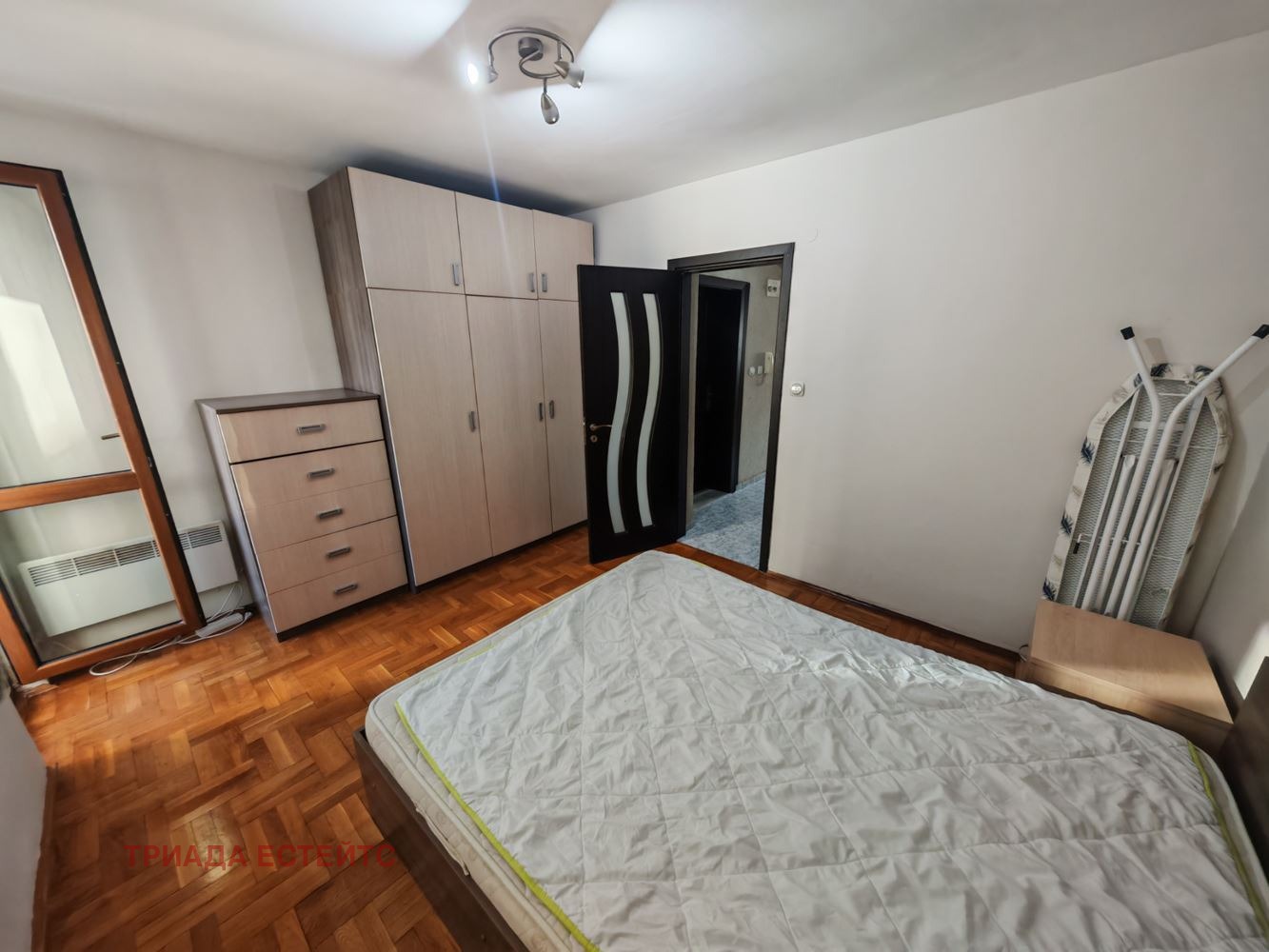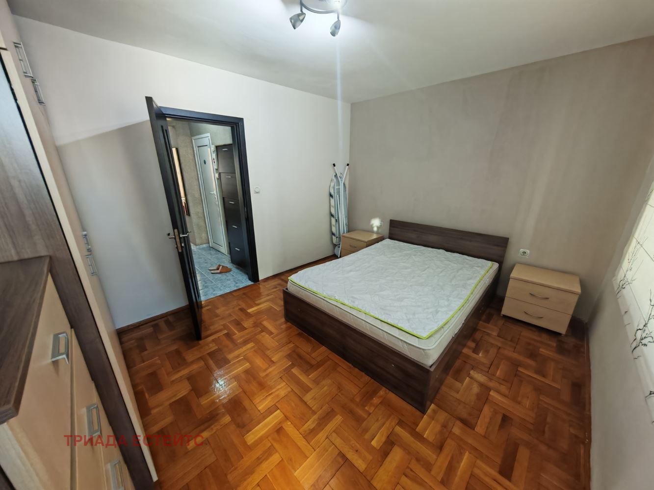 Спалня: Просторна и уютна, с голямо двойно легло, нощни шкафчета и висок скрин за съхранение и гардероб. Разполага с добре поддържан паркет и достъп до тераса.