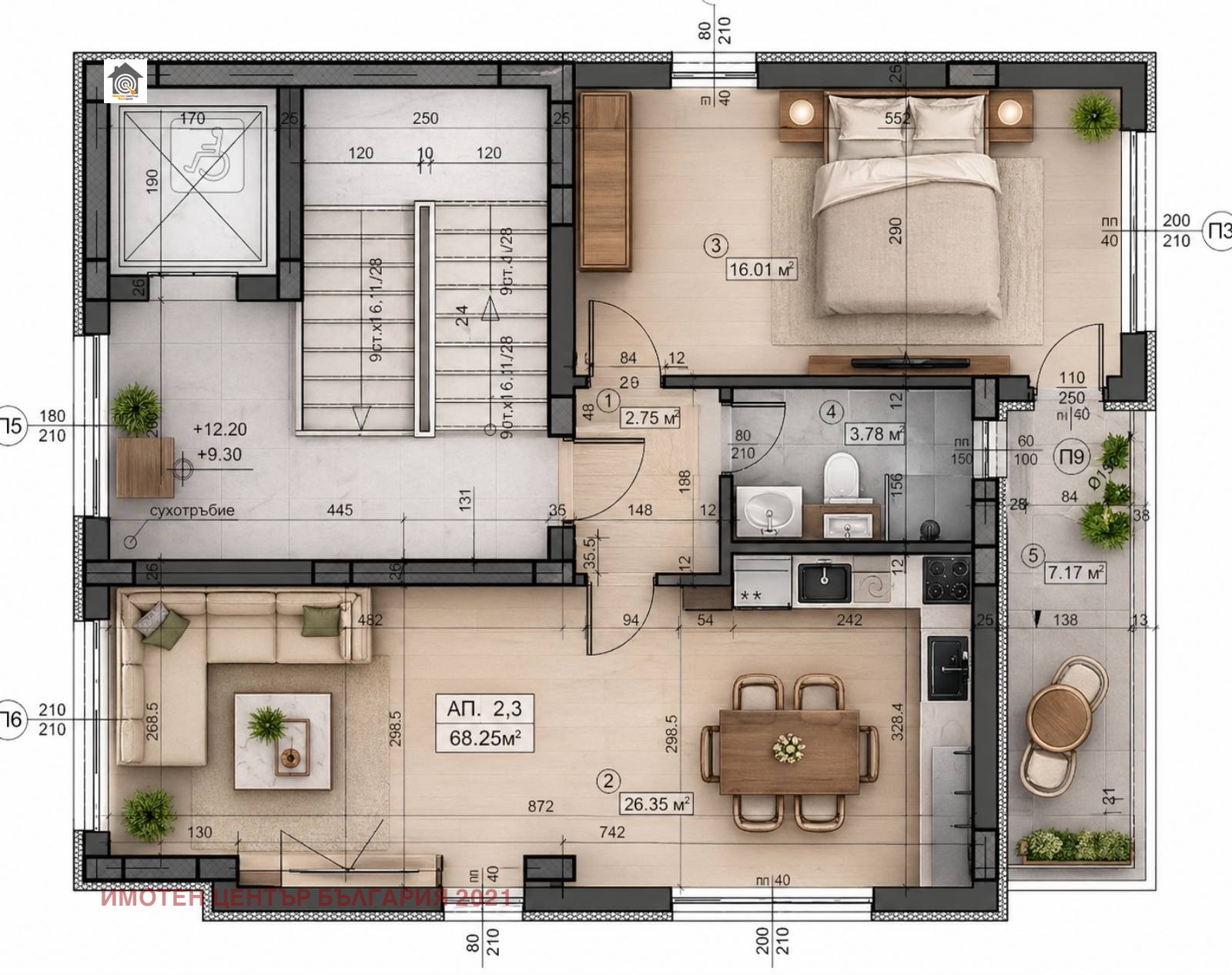 Малка сграда с по 1 апартамент на етаж. Просторен 2-стаен с изложение юг/изток 26кв.м всекидневна и 16кв.м спалня. На кота +9.30м. Остатъчни плащания на всеки етап от строителството. Към апартамента се прехвърля и 40кв.м. от УПИ-то. Продава се и наземно паркомясто 8 на цена 20 000 . Перфектен е както за собствено ползване, така и за отдаване под наем като ние от 'Имотен център България' предлагаме цялостно управление на имота със сигурен ежемесечен доход на пазарната цена, дори и при период без наематели. От нас може да очаквате:
