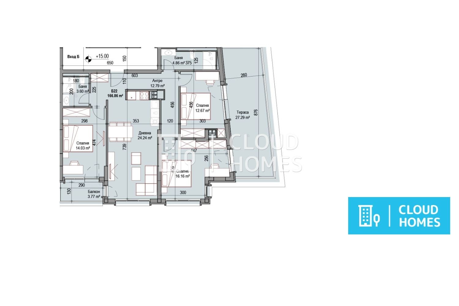 Жилището предлага функционално разпределение и изобилие от естествена светлина. Състои се от широко антре, просторна дневна с кухненски бокс и трапезария с площ над 24 кв.м и излаз към тераса, три самостоятелни спални с удобни размери, две бани с тоалетни, както и допълнителен балкон. Към имота принадлежи и впечатляваща тераса с площ над 27 кв.м, която предоставя отлични възможности за обособяване на зона за отдих, хранене или озеленяване.