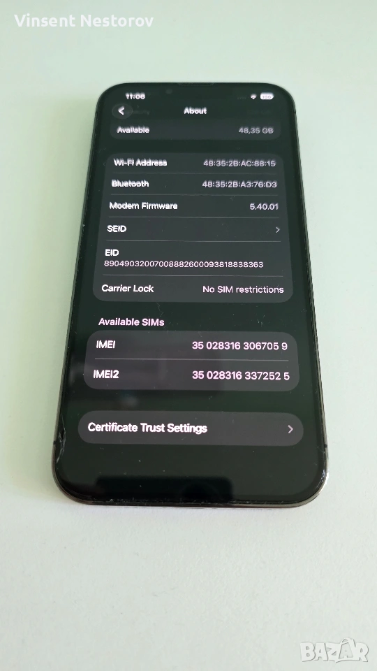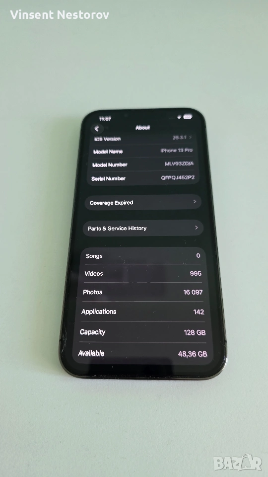 Продавам iPhone 13 Pro с вътрешна памет от 128GB.