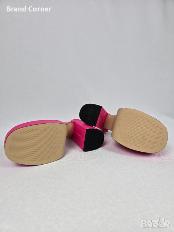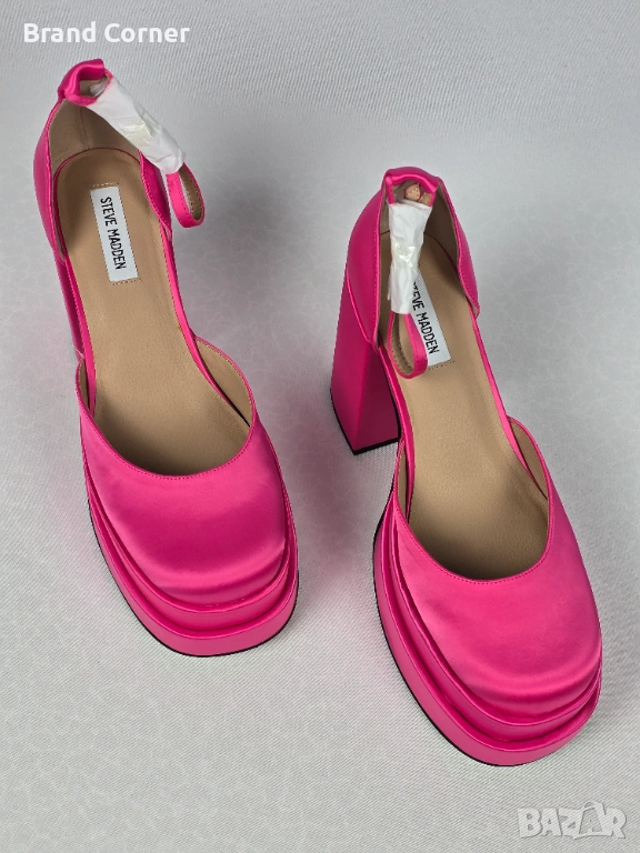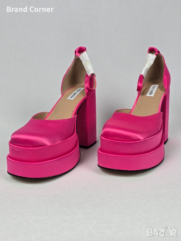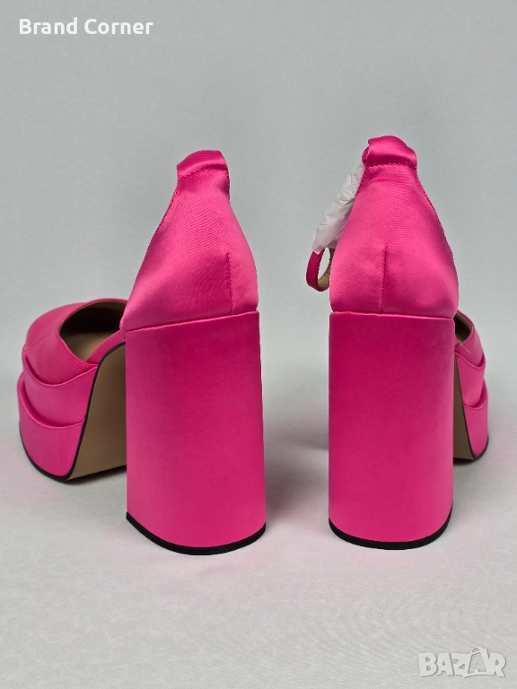 Моделът е ефектен и много разпознаваем – в ярък цикламeн / hot pink сатен, с масивна двойна платформа, висок стабилен ток и каишка около глезена. Обувките имат модерна форма с леко заоблен квадратен връх, отворена странична линия и удобна по-стабилна конструкция благодарение на широкия ток и платформата.