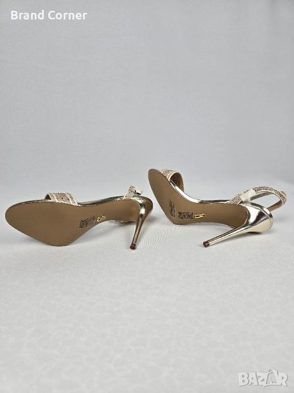Стелката е в металик златисто, а дизайнът е много женствен и издължава крака. Закопчаването е с регулируема каишка около глезена за по-добро прилягане.