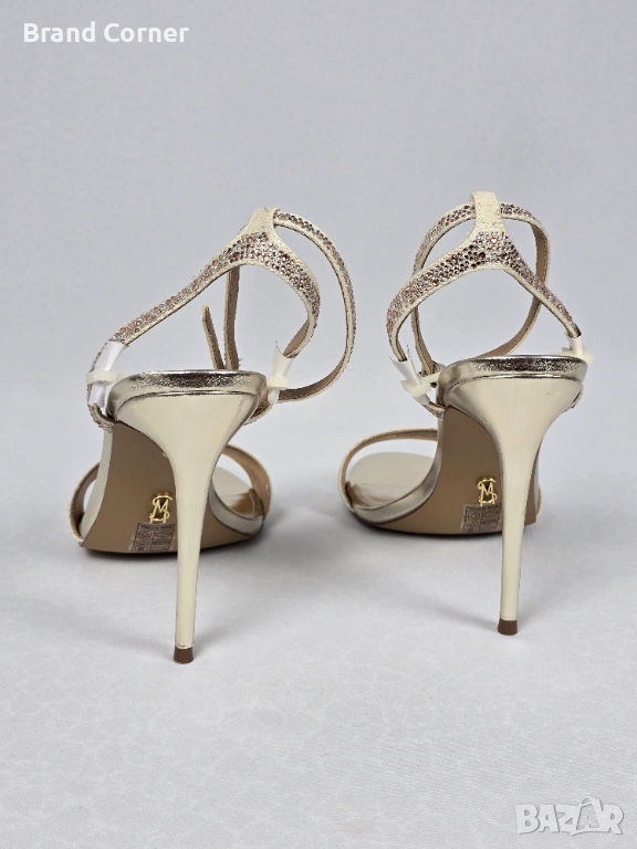Моделът е елегантен и ефектен, подходящ за сватби, балове, официални поводи, вечерни събития и специални визии. Сандалите са с тънък висок ток, отворена предна част и фини каишки около глезена. Предната лента и каишките са декорирани с блестящи камъчета, които придават луксозен и празничен вид.