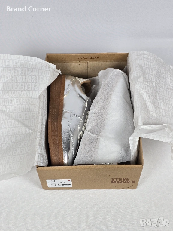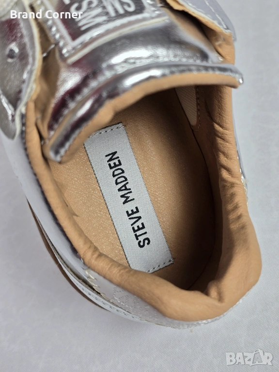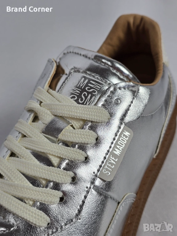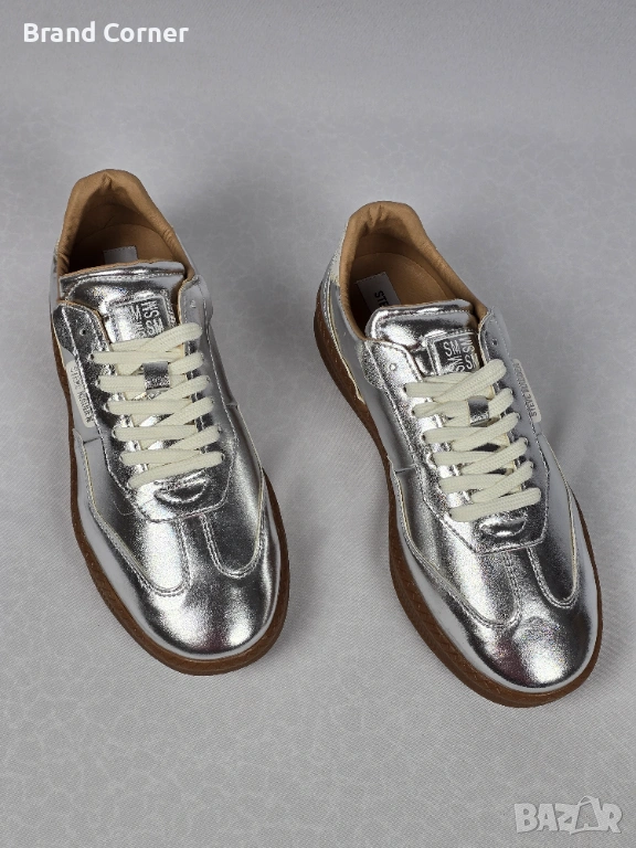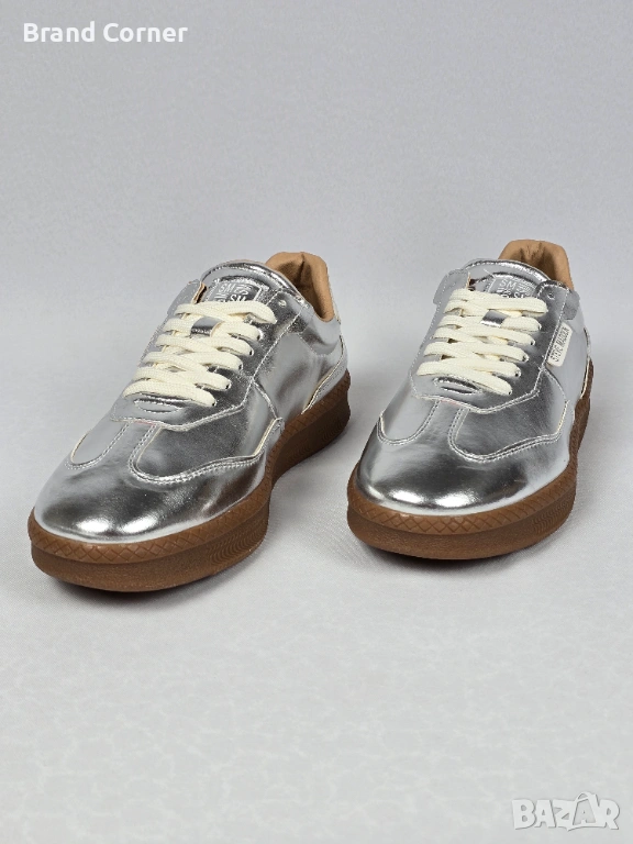 Моделът е в ефектен металически сребрист цвят, който веднага прави визията по-модерна и отличителна. Обувките са с нисък сникърс силует, удобна връзка, мека вътрешна част в бежово-кафяв нюанс и стабилна гумена подметка в карамелен цвят.