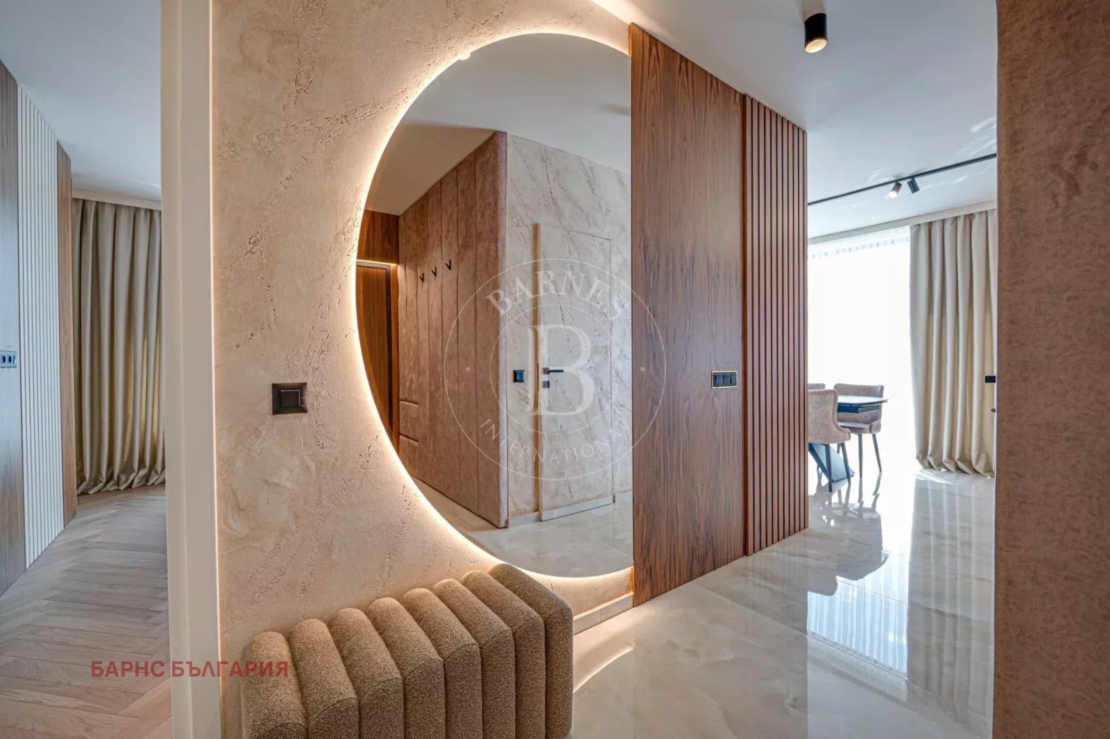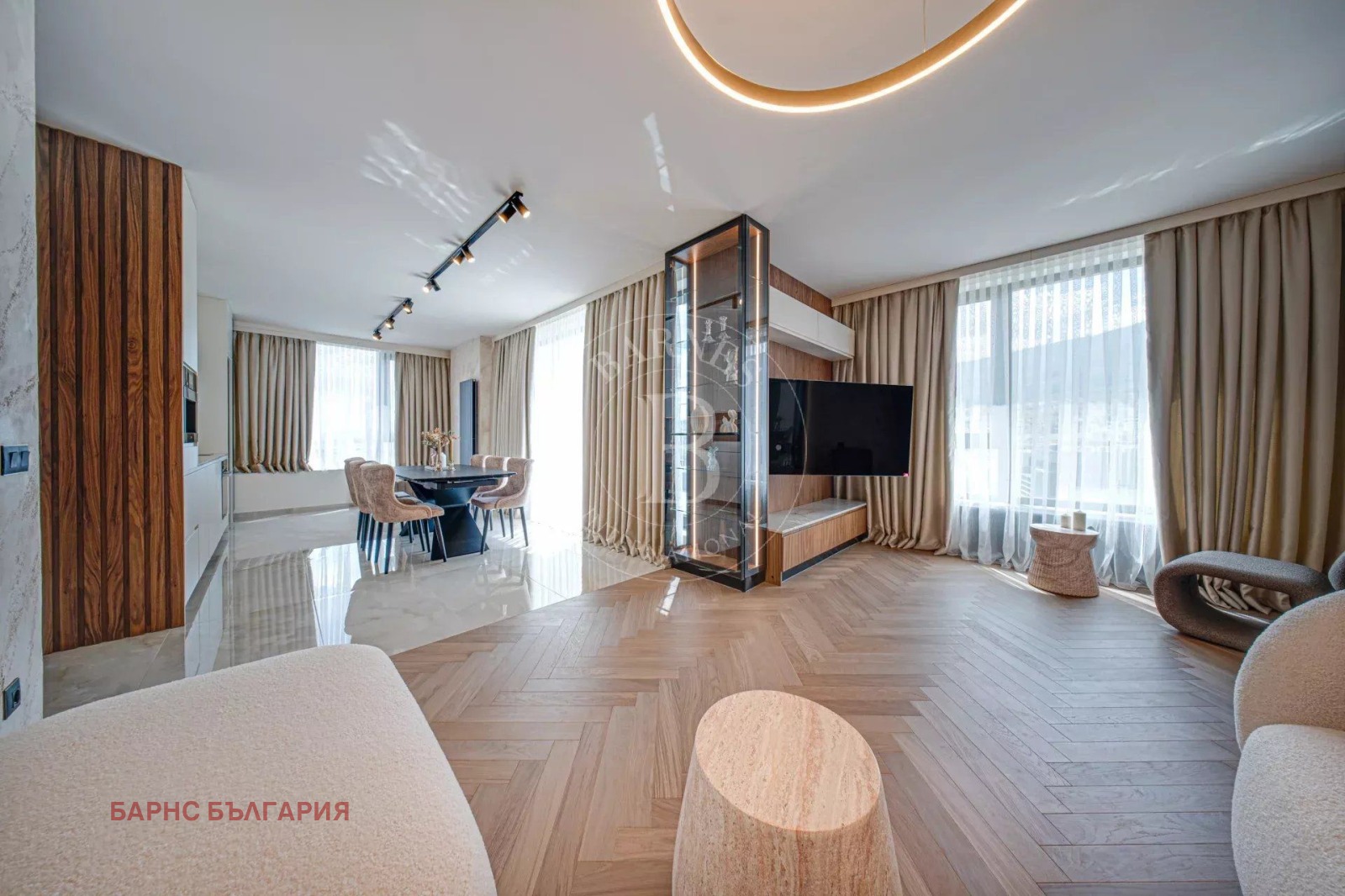 Интериорът е изпълнен без компромис – с висок клас материали, дизайнерски решения, техника и мебели по поръчка: