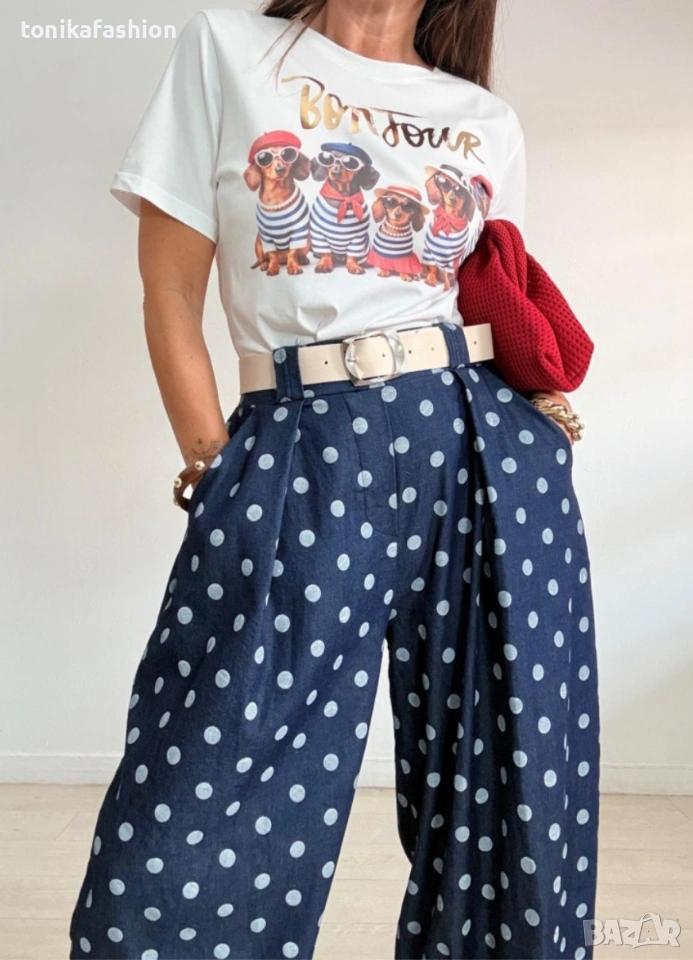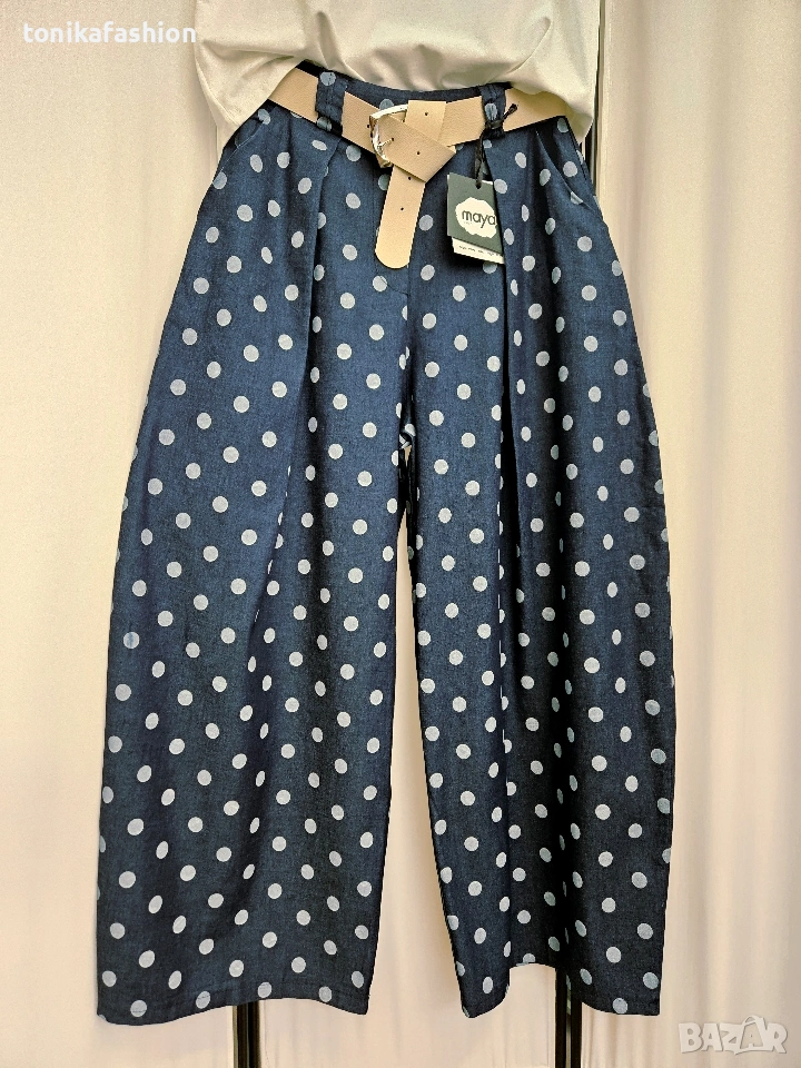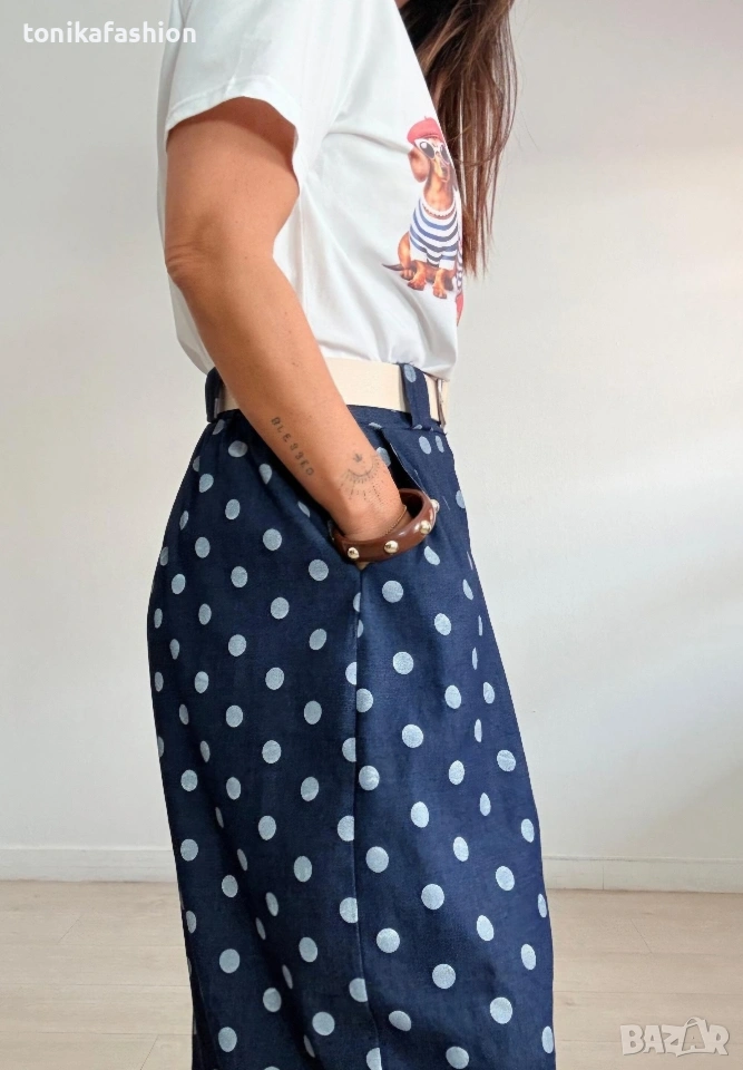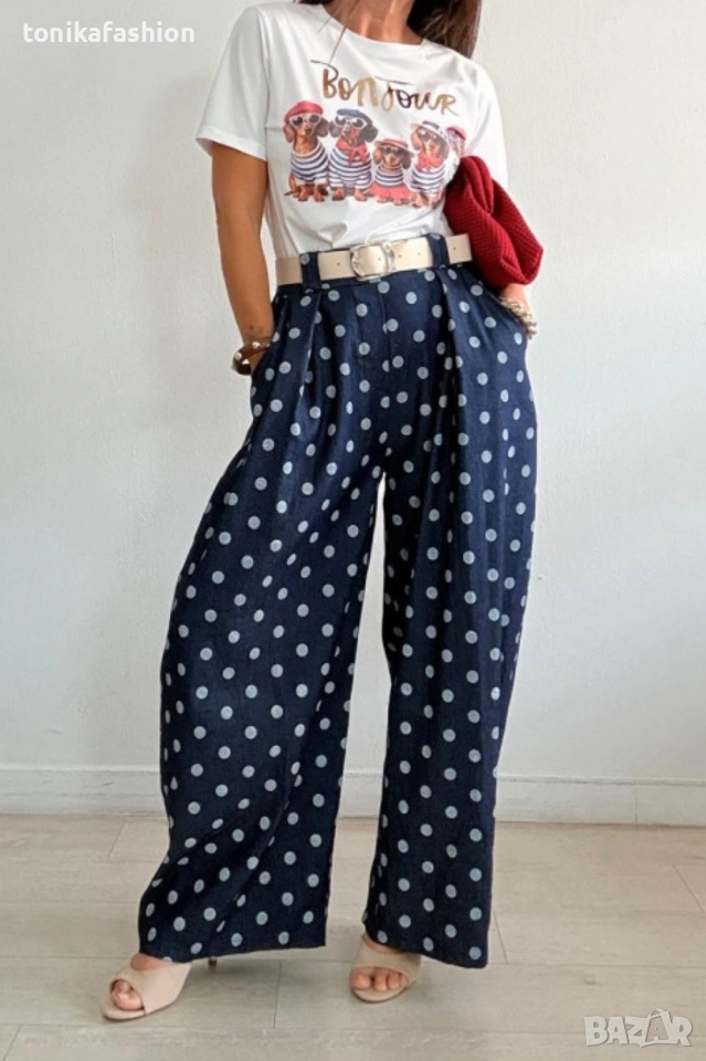Хит панталон на точки в тъмно син тънък памучен плат.Модел с широки крачоли тип балон, чупки на предниците и джобове.На гърба на талията с ластик.Към него има екрю колан от еко кожа. Универсален размер подходящ от М до ХL.