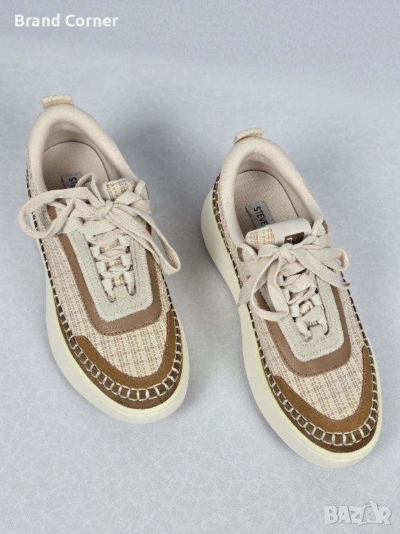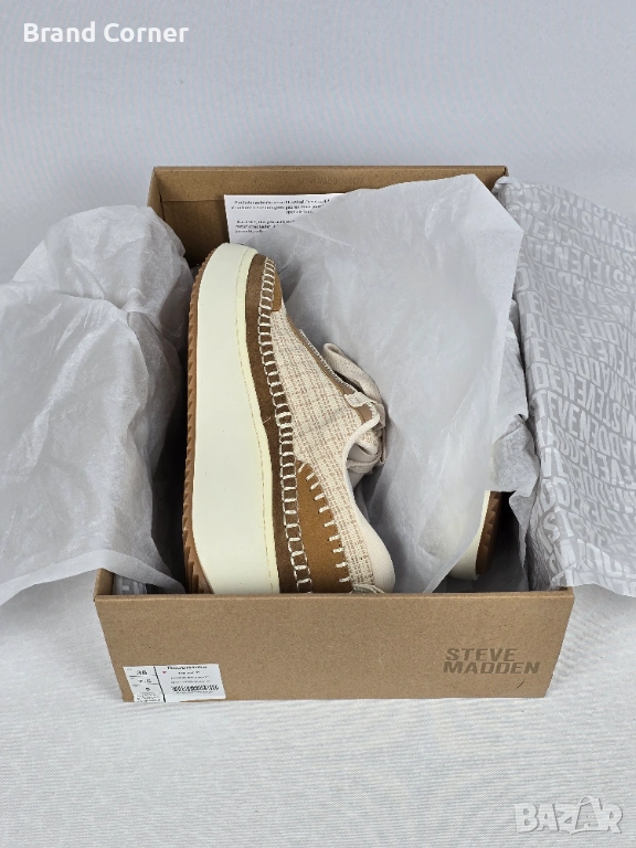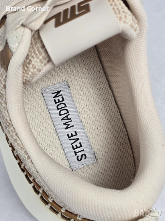 Обувките са нови, без следи от носене. Подметките са чисти, етикетите и брандираните детайли са запазени. Отзад има релефно лого Steve Madden, както и брандирани елементи от вътрешната страна и върху езика.