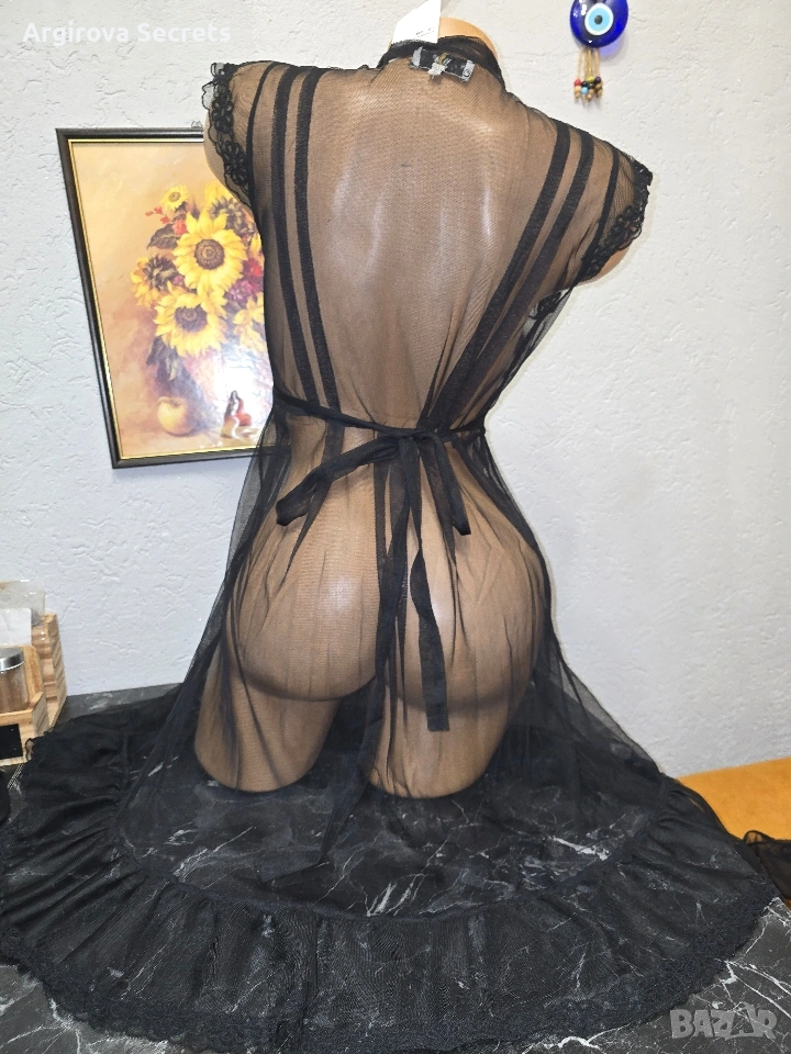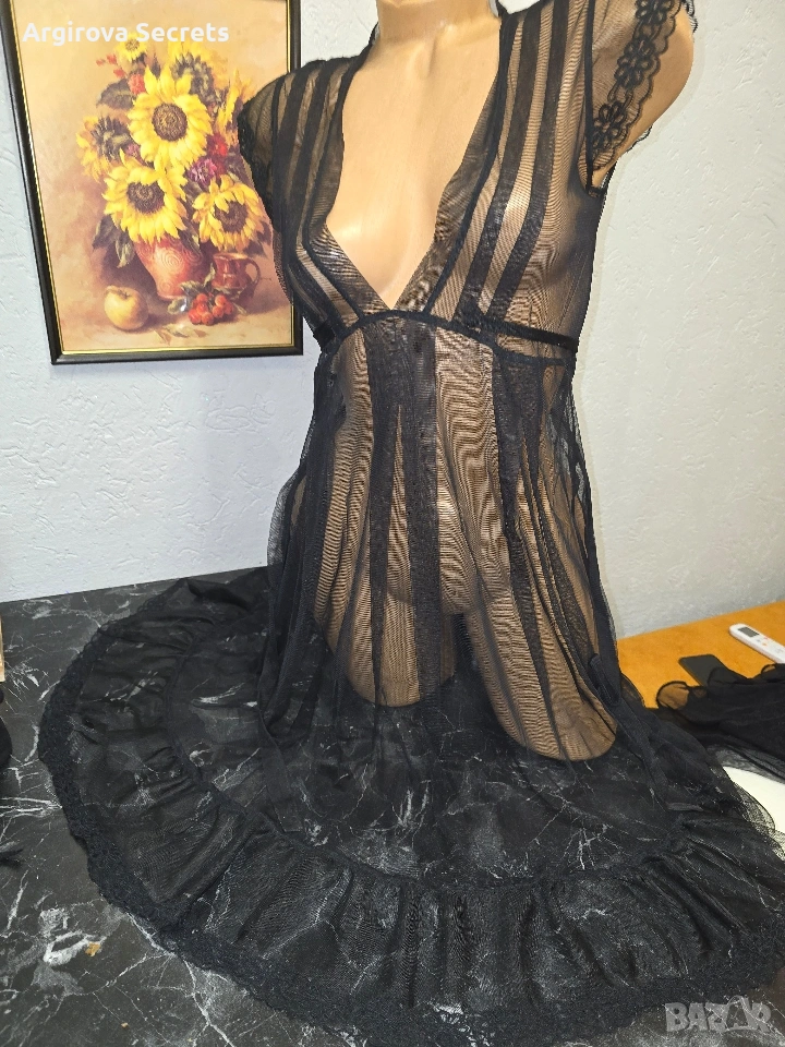 Описание. Елегентна полупрозрачна нощничка с дълбоко деколте, изработена от комбинация тюл и нежна дантела завършваща с широк волан в долния край. Акцентът на талията е нежно тюлено коланче което се завръзва под бюста подчертавайти бюста. Подарете си моменти на чист лукс и съблазъм с това бижу.