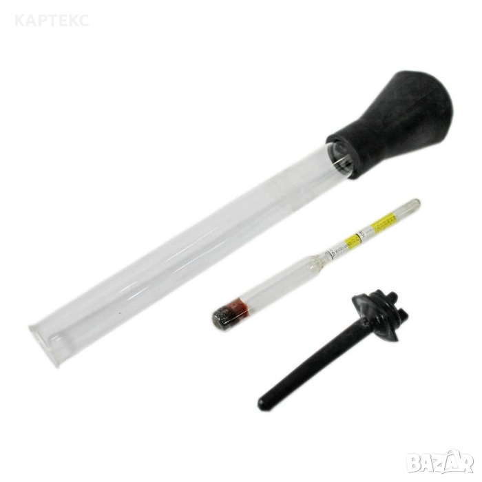 Модел: 18103 Тестер за антифриз измерващ всички видове антифриз. Изключително здрав. Индикатор: Плаваща вътрешна стъклена тръбичка. Тяло: Стъкло. Измерва с точност точката на замръзване на Вашата охлаждаща течност, независимо от нейната температура. Диапазон на измерване от 0 до -40 градуса.