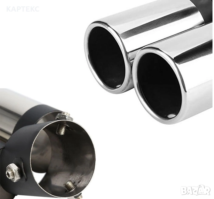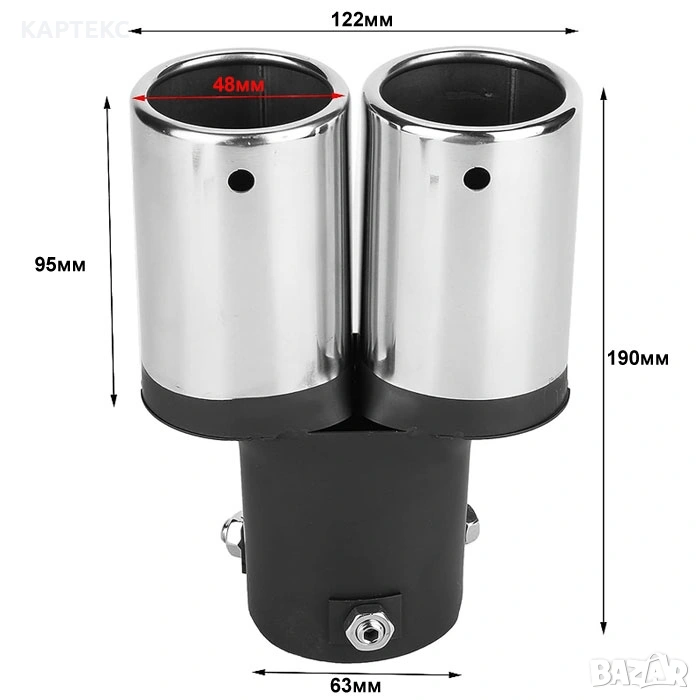 Модел: 352026 - 1990BK Двоен универсален накрайник за МПС. Двойните изпускателни глави ефективно повишават налягането на изгорелите газове и намаляват шума. Начин на монтиране: чрез болтове. Придава спортен вид на вашият автомобил. Цвят: хром и черен мат Вход на накрайника: 60 мм Изход на накрайника: 2 х 48 мм Дължина на накрайника:190 мм