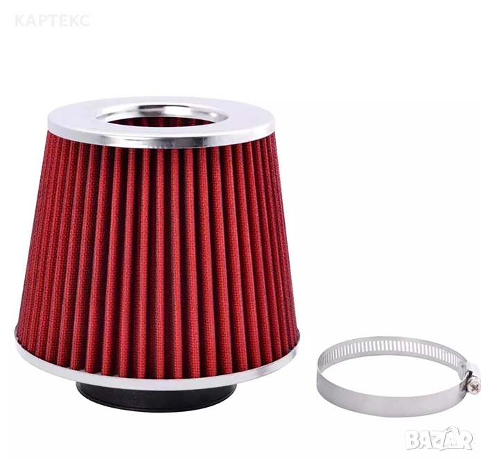 Модел: 49327 - 2004. Спортен въздушен филтър универсален. Диаметър на отвора: 60мм/63,5мм/70мм Подобрява приемането на въздуха в горивната система. Придава специфичен звук на двигателя и е с подобрени филтриращи свойства, спрямо оригиналният филтър. Може да бъде поставен на място, което ще доставя повече студен въздух, за намаляване на температурата на гориво-въздушната смес. Смяната му е по-рядка от обикновения филтър, и може да бъде почистен с препарати определени за тази цел. Спестявате излишни разходи, поради факта, че издържа повече километри от обикновеният филтър. Изработен от висококачествени материали. Цвят:Червен