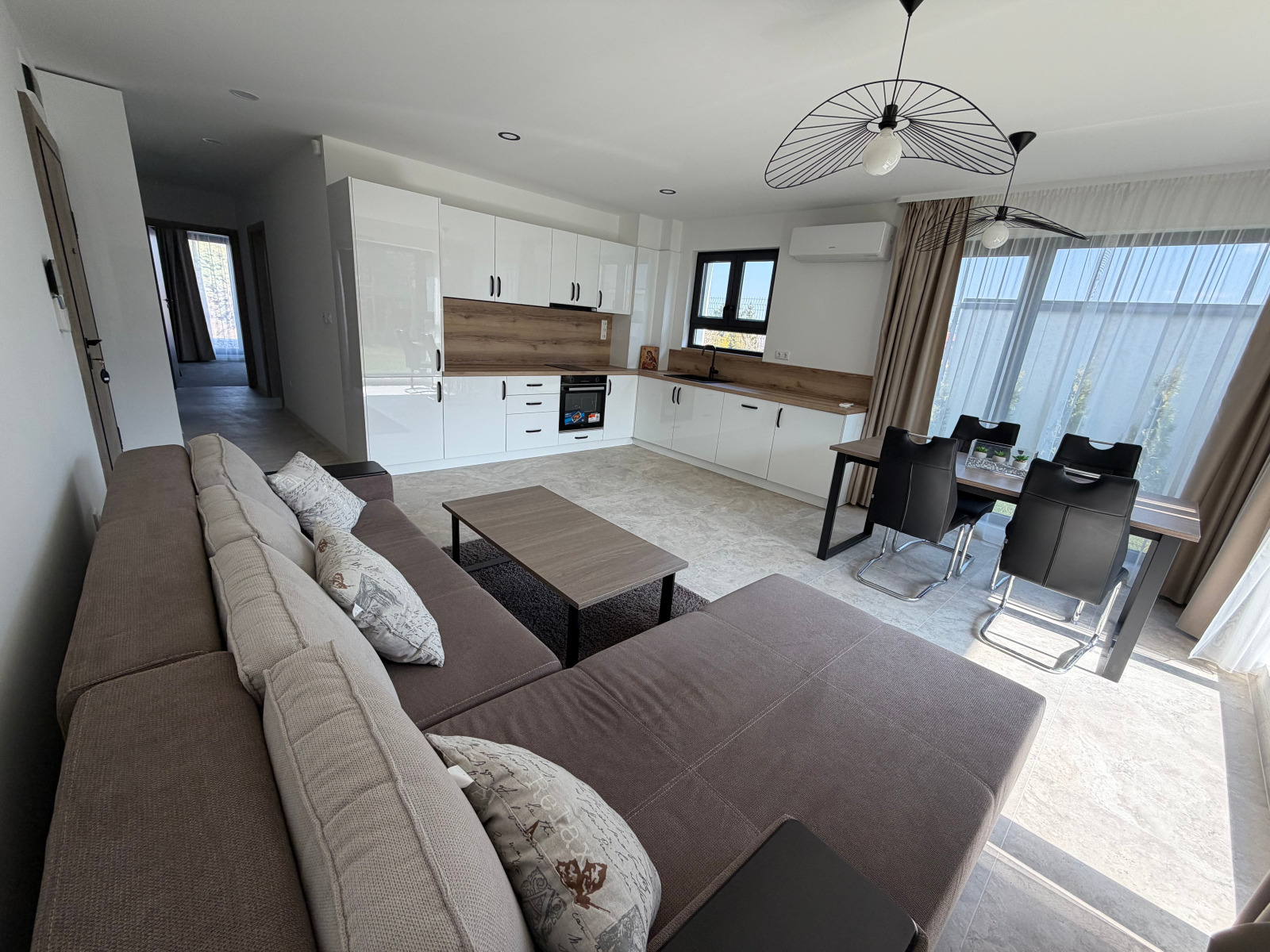 Предлагаме на вашето внимание апартамент ПОД НАЕМ - 3-стаен напълно обзаведен АПАРТАМЕНТ С ДВОР, ПАРКОМЯСТО И МАЗЕ. Имотът се намира на етаж 1 в новопостроена 3-етажна жилищна сграда, находяща се на адрес гр. София, кв. Симеоново, ул. 78, номер 9. Районът е изключително спокоен и тих, сградата се намира на малък асфалтов път на 3 минути от Ринг Мол. Апартаментът е просторен и светъл, изцяло ново обзаведен, с подово отопление на газ и климатици във всички стаи, с напълно озеленен двор с напоителна система, видео достъп и охранителна система. Площта на апартамента е 103кв.м., състои се от голямо общо помещение (хол, кухня и столова), коридор, две спални, две бани и обслужващо помещение. Наемната месечна цена включва апартаментът с прилежащия му двор 153кв.м., мазе 15кв.м. и паркомясто. Цената е 1100 евро без ддс, предлага се от фирма.