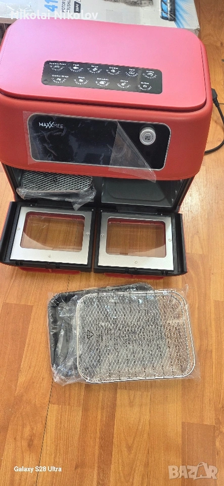 фритюрник с горещ въздух) Мощност: 2400 W Капацитет: 11 л (по 5,5 л всеки) Температура: 45-200°C Аксесоарите са безопасни за миене в съдомиялна: да Нескользящи крака: да Дръжка и корпус с охлаждаща повърхност: да Брой програми: 11 Брой прозорци за наблюдение: 2 С цифров дисплей за максимален комфорт на потребителя Функция за таймер от 60 минути за прецизно готвене Автоматично изключване в края на процеса на готвене Цвят: червен заповече информация на лично