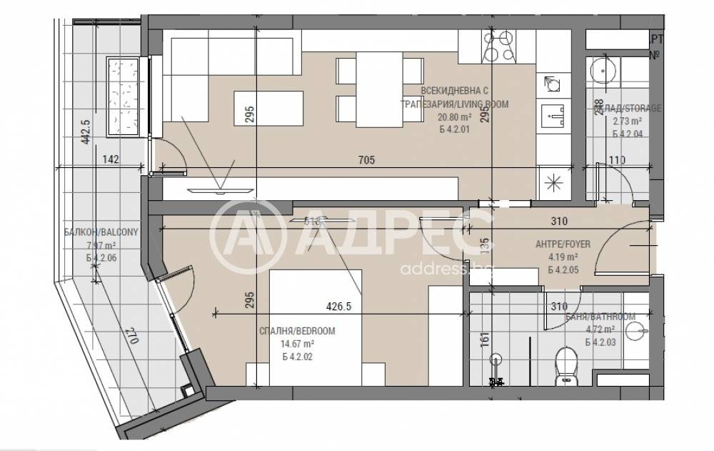 - разпределение: входно антре, всекидневна с кухненски бокс, спалня, баня с тоалетна, склад и балкон.