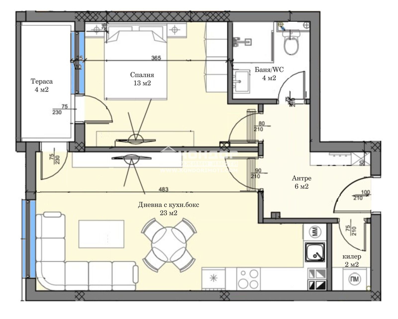 Оферта 65162 - АКТ 16!!! Бутиков затворен жилищен комплекс с Акт 16 с модерна и устойчива архитектура, потопена в богато озеленени площи, вдъхващи на живущите комфорт и спокойствие. Комплекса предлага просторна спокойна среда с бърз достъп до центъра на града, както и възлови булеварди. Предлагаме ви двустаен апартамент, който се състои се от дневна с трапезария и кухненска част- 23 кв.м. , една самостоятелна спалня 13кв.м., баня с тоалетна, широко входно антре с място за гардероб, килер и тераса. В близост са ситуирани ресторанти, хипермаркети, училища и детски градини. Луксозни общи части с предоставено облагородено дворно място, пейки за отдих и детски площадки за игра. Апартамента е издаден на: