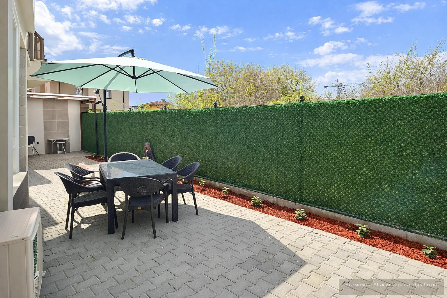 Имотът е ситуиран на 1-ви жилищен етаж и разполага с площ 65кв.м, разгърната в следното разпределение: входно антре, хол с кухненски бокс и трапезария, спалня, баня с тоалетна и двор с площ 60кв.м.
