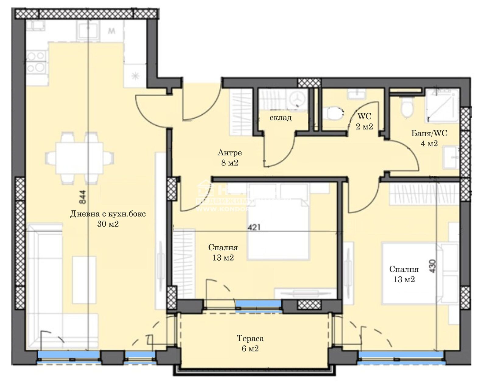 Оферта 65941 - Предлагаме Ви възможността да закупите тристаен апартамент в новоизграждащ се луксозен жилищен комплекс с модерна визия, проектиран да създаде максимален комфорт на живущите в него. Функционално разположени жилищни секции с елегантен силует готов да предложи комфорт и модерен начин на живот. Едно от основните му предимства е страхотната локация, отлична комуникативност и динамична пътна инфраструктура, която осигурява бърз и лесен достъп до комплекса, от всяка точка на града. Той съчетава лукс, спокойствие и комфорт, с подсигурени паркоместа и гаражи. Жилището се състои от просторна дневна 30кв.м. с кухненска част и трапезария, две самостоятелни спални по 13кв.м., баня с тоалетна, втора тоалетна, склад, антре и тераса, обща за трите стаи. Основната концепция при проектирането е да се постигнат просторни и функционални стаи, с цел да се създаде максимален уют на модерното семейство. Изключителна съвременна архитектура и модерна технология на строителство. Визията е иновативна, привличаща внимание с уникалността си. Всяко жилище ще разполага с пълно окабеляване за домофон, интернет и кабелна телевизия, общите части са луксозно завършени, жилищата са с алуминиева дограма с троен стъклопакет от най-висок клас, масивна блиндирана входна врата. За удобство на живущите съществува възможността да закупят подземни паркоместа и гаражи с топла връзка към комплекса.