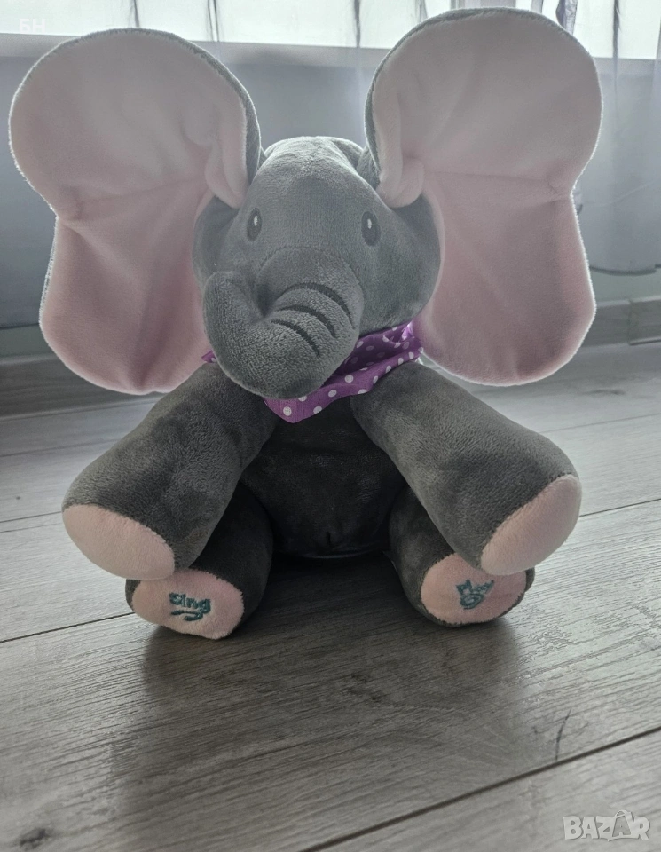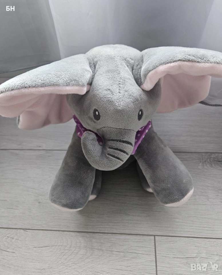 Слонче, изключително весела, интерактивна и забавна играчка за деца. - десният крак е снабден с бутон Play , като с натискането му се стартира играта Peek a Boo, движение на ушите закрива лицето си, крие се и говори ( пита "къде си?" и др. на английски ) и се смее с вашето дете! - левият крак е снабден с бутона Sing , като натискайки го, слонът ще пее весела песен на английски, докато движи ушите си. Няма следи от употреба, няма забележки . За Пловдив лично предаване/вземане.