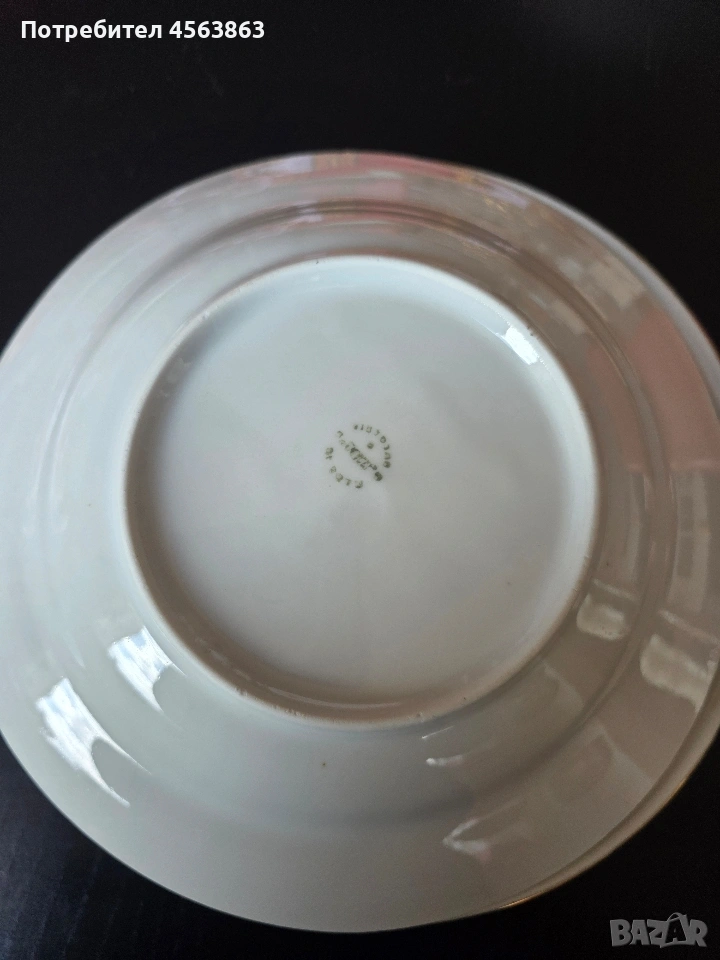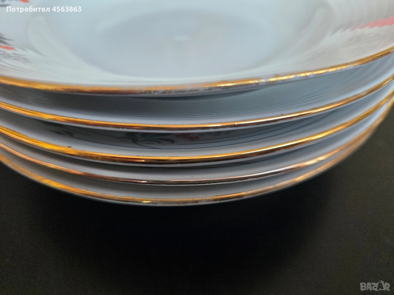 5 чинии с диаметър 22,5см. и частично протърквани на златния кант.